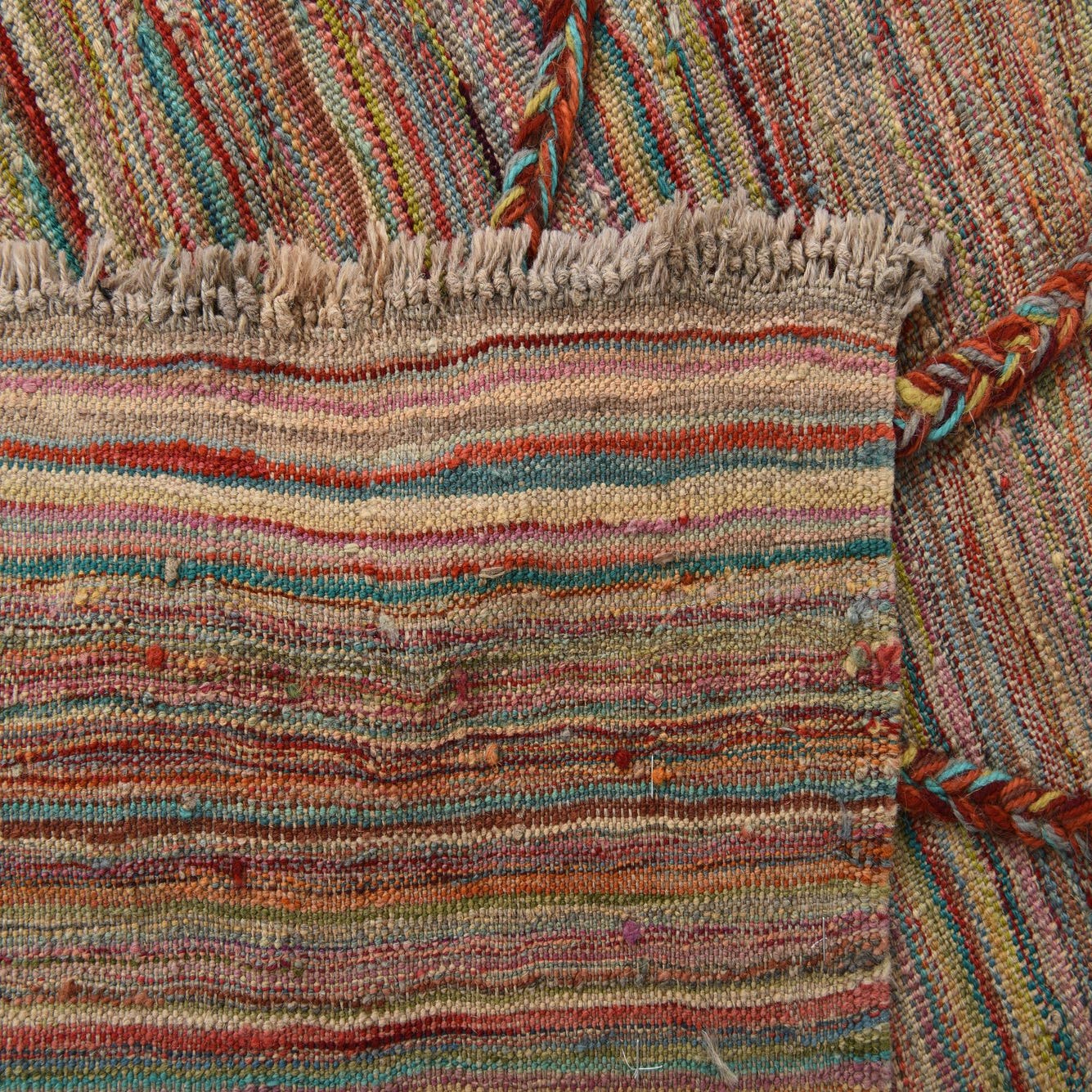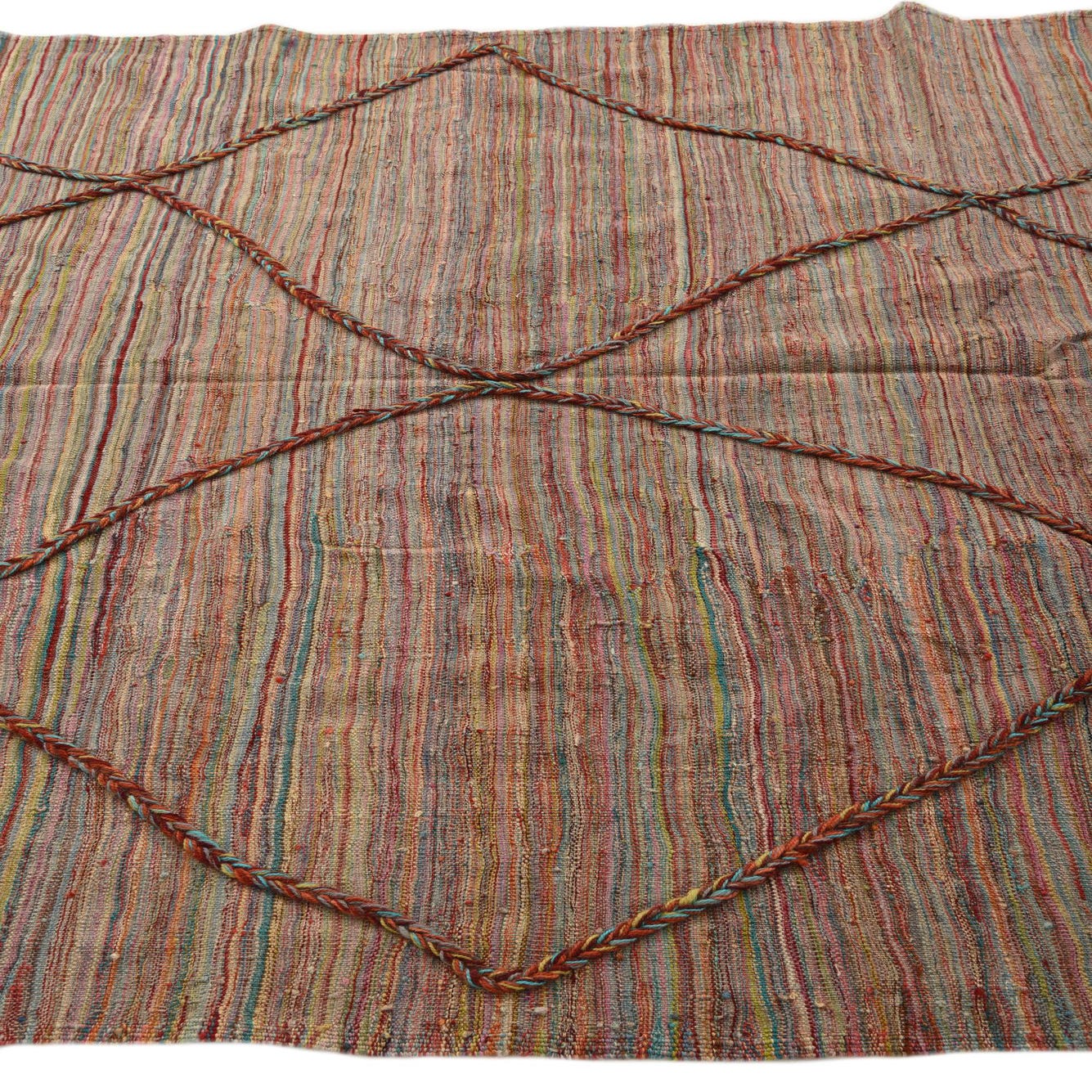 A 5x8 multi-colored flatweave wool rug with a vibrant striped pattern and braided tribal diamond design.