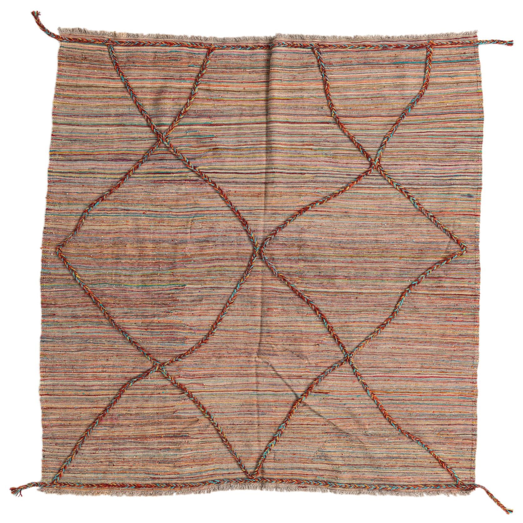 A low-profile, hand-woven wool kilim with narrow, horizontal striations of color across a multi-hued ground, crossed by raised braided cords that create oversized diamond motifs. The flatweave surface has a tactile, slightly rustic feel underhand, while the braided accents add gentle dimensionality and movement. Woven from 100% wool, the palette combines warm neutrals and lively accents—beige, blue, brown, light blue, light brown, light green, light salmon, olive, orange, terracotta, turquoise, yellow, red, purple and pink—so the overall impression is layered and lived-in without overwhelming a room.