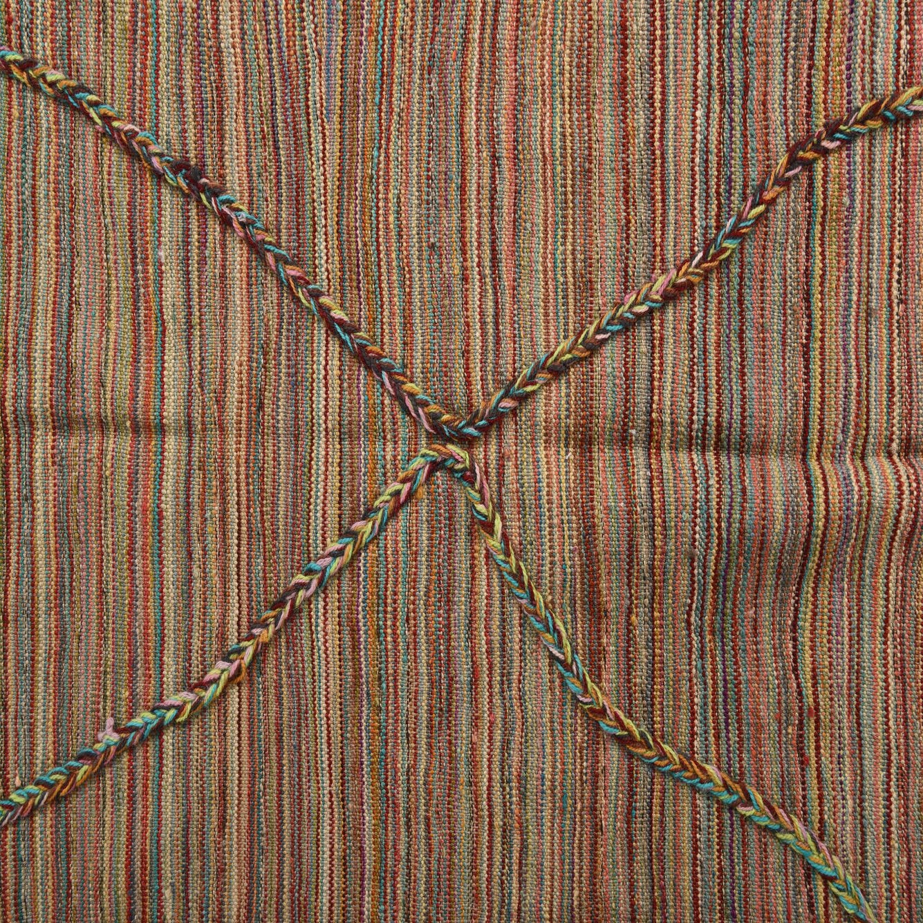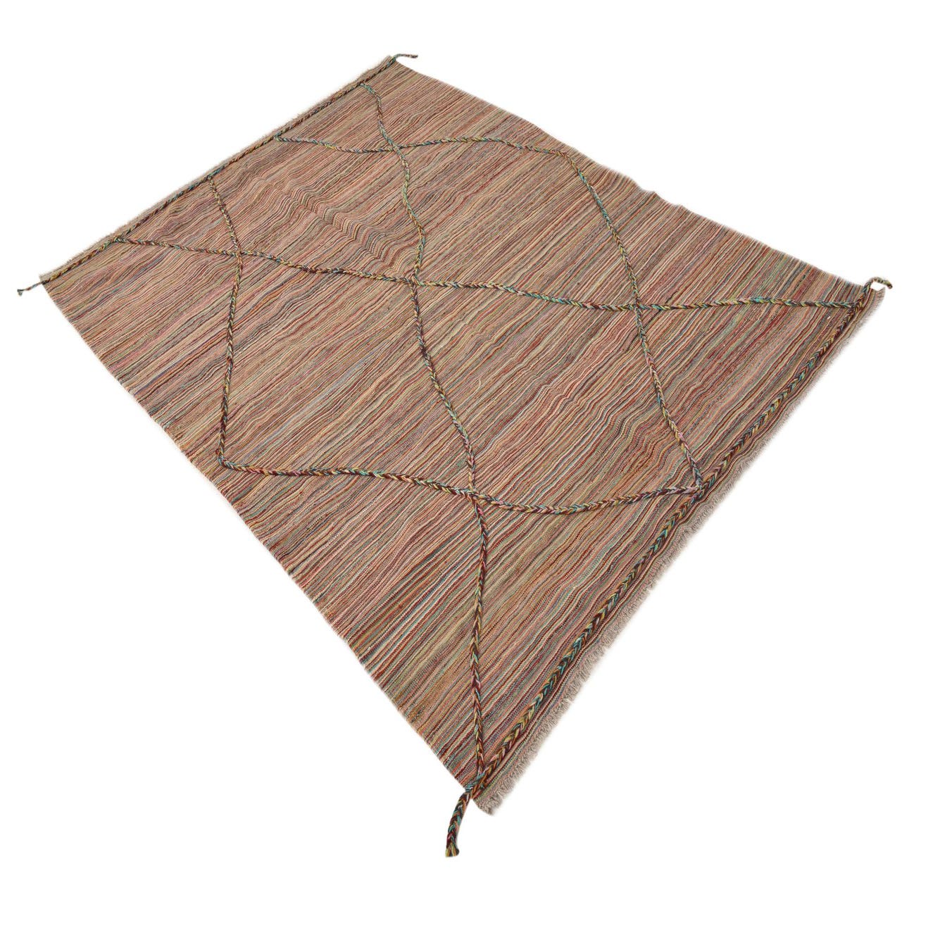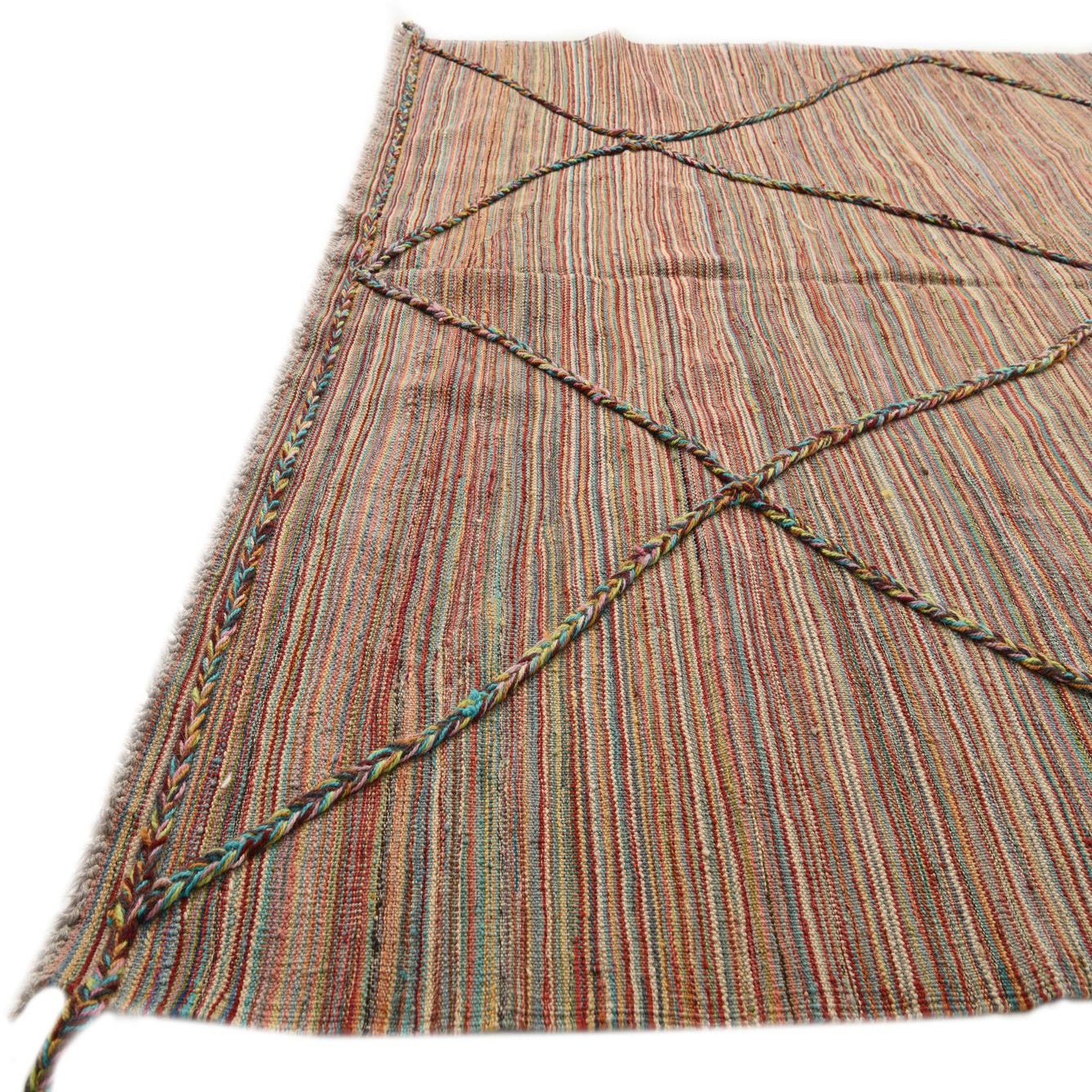 A multicolored, finely striped ground of warm rusts, burgundy and brown is threaded with cooler notes of blue, light blue, olive and gray to create a subtly variegated field. Bold, braided cords cross the weave in a loose diamond lattice, their twisted strands showing pops of gold, green, orange and light salmon that lift the pattern and add rhythmic geometry. Short tassels and a braided trim at the ends reinforce the handcrafted character.
