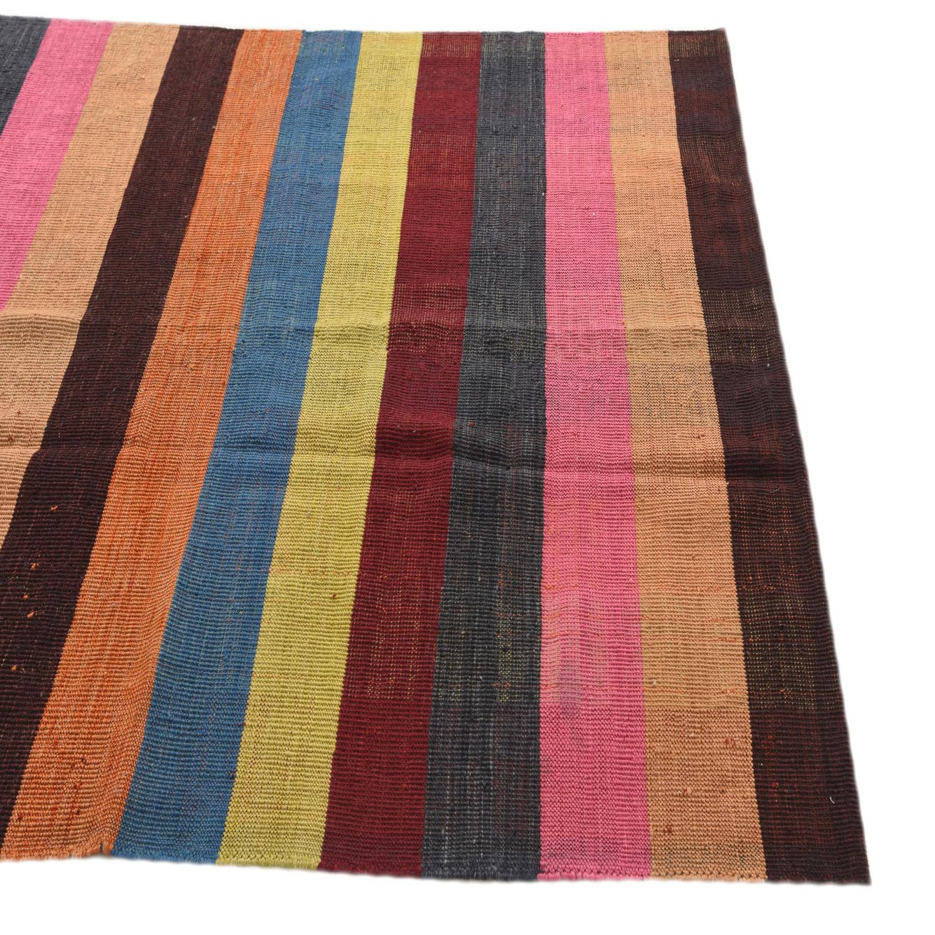 The Kilim Modern collection presents a visually compelling 5x8 hand-woven rug crafted from 100% wool. The design showcases a vibrant and dynamic striped pattern, incorporating a broad spectrum of colors including beige, black, blue, brown, burgundy, yellow, and orange on a multi-colored background. The precise hand-woven construction ensures a flatweave texture that is both tactile and durable.