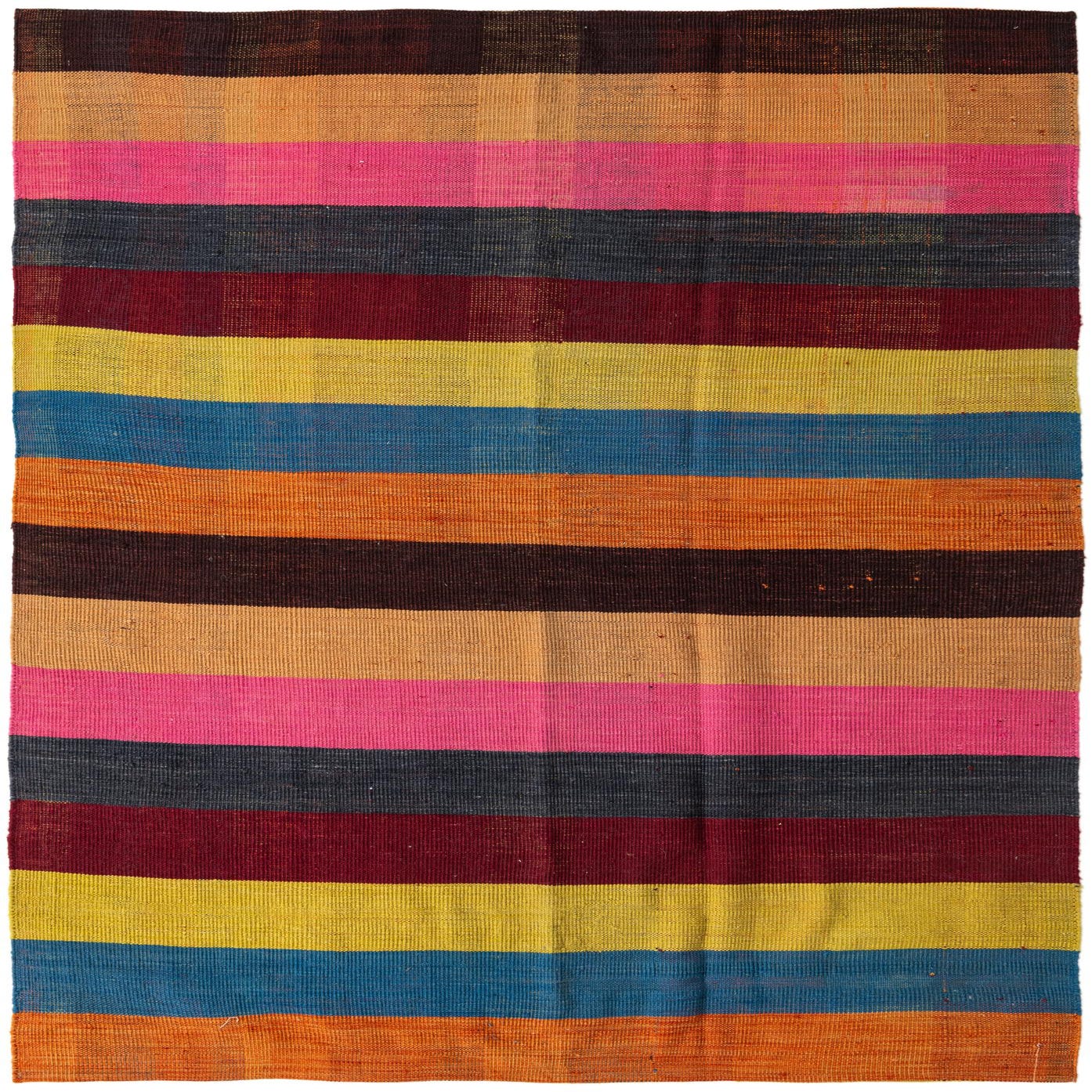 A vibrant 5x8 rectangular Kilim Modern rug with horizontal stripes in pink, blue, yellow, orange, red, and dark gray.