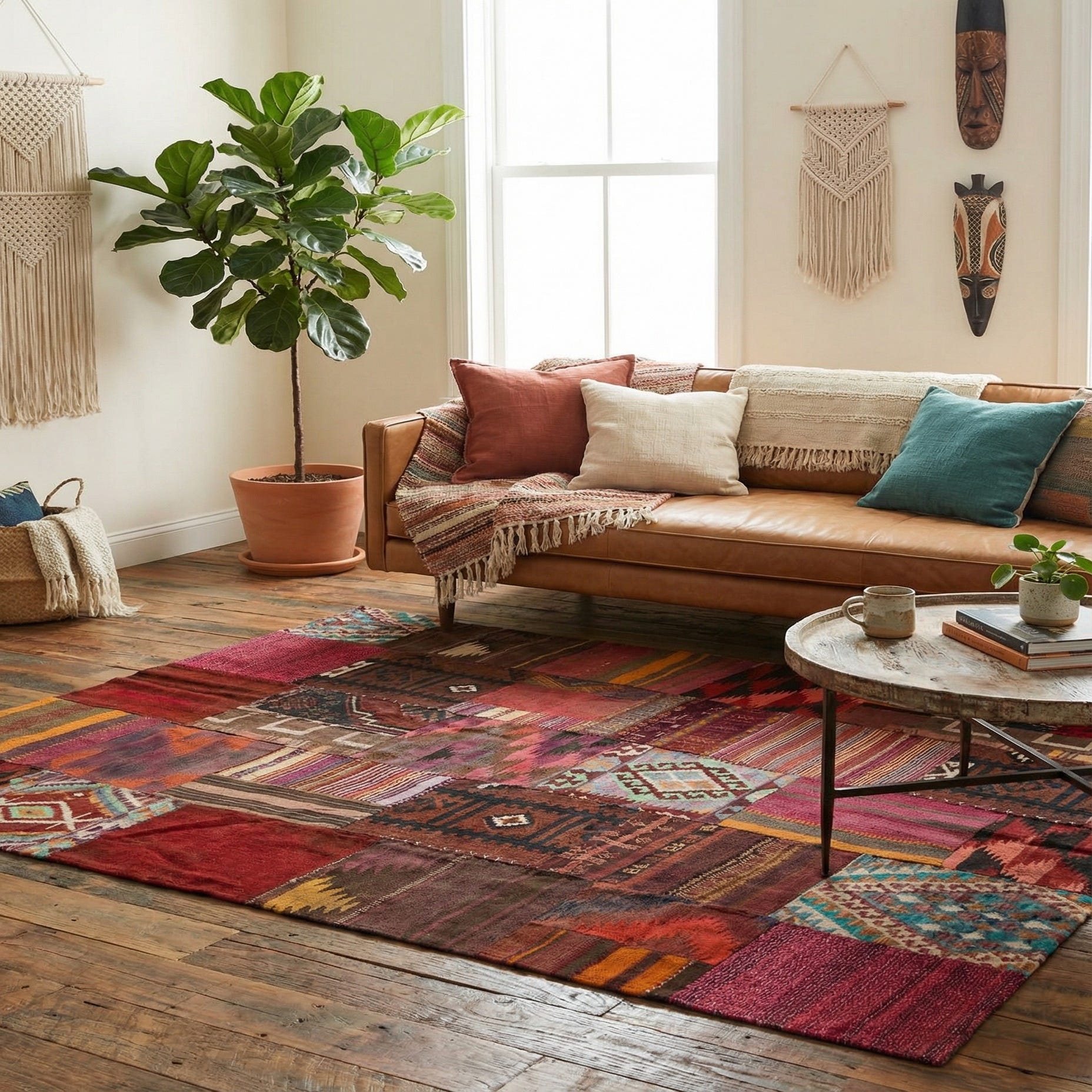 A 5x8 rectangular multi-colored patchwork Kilim rug, handmade from wool, featuring various tribal and geometric patterns.
