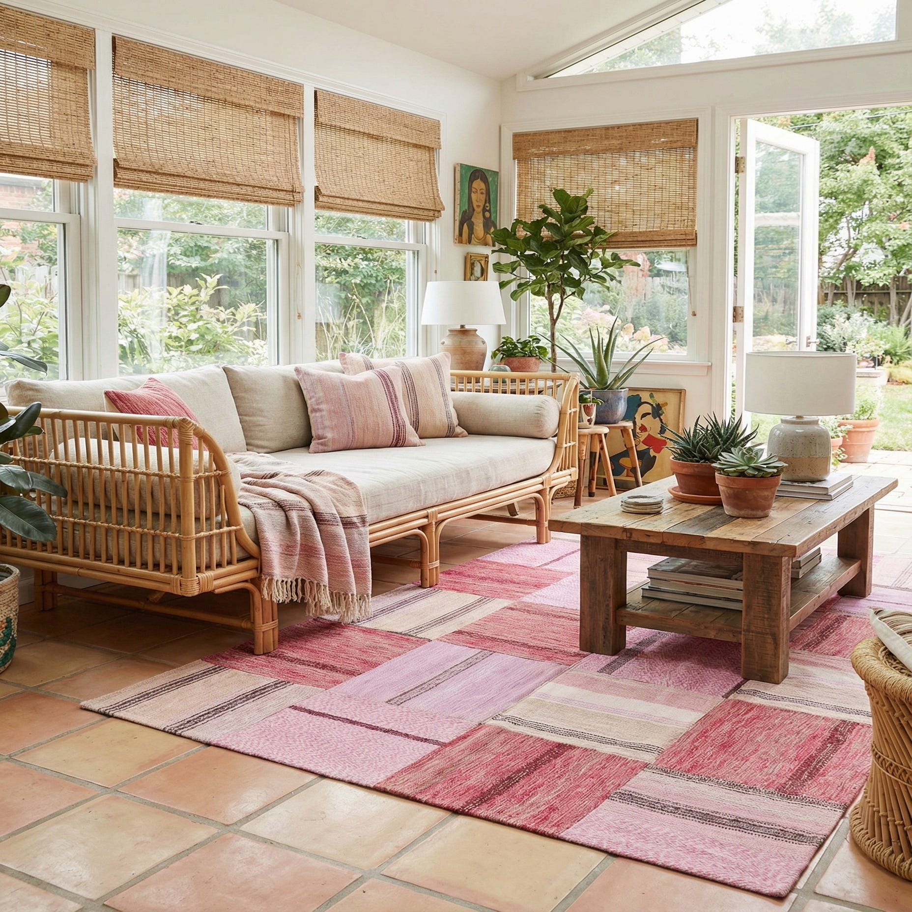 A 5x8 rectangular Kilim Patchwork rug with a vibrant multi-colored design, featuring various shades of pink, red, and beige woven wool patches, ideal for a living room.