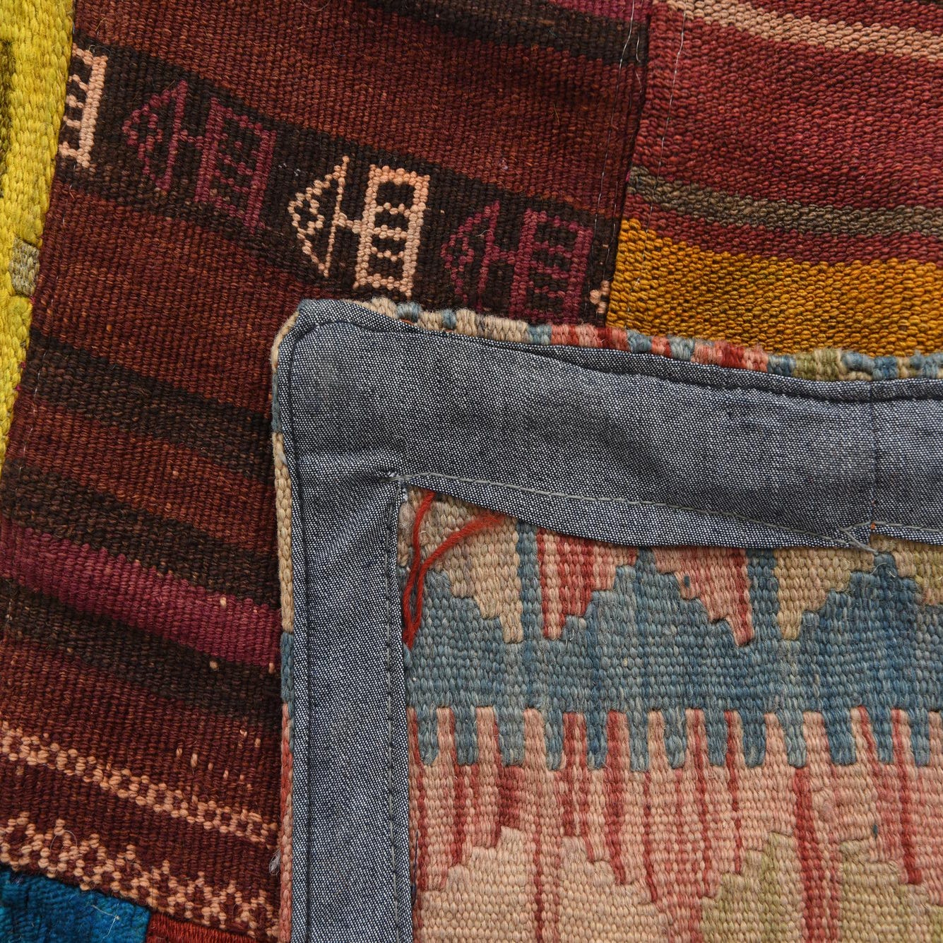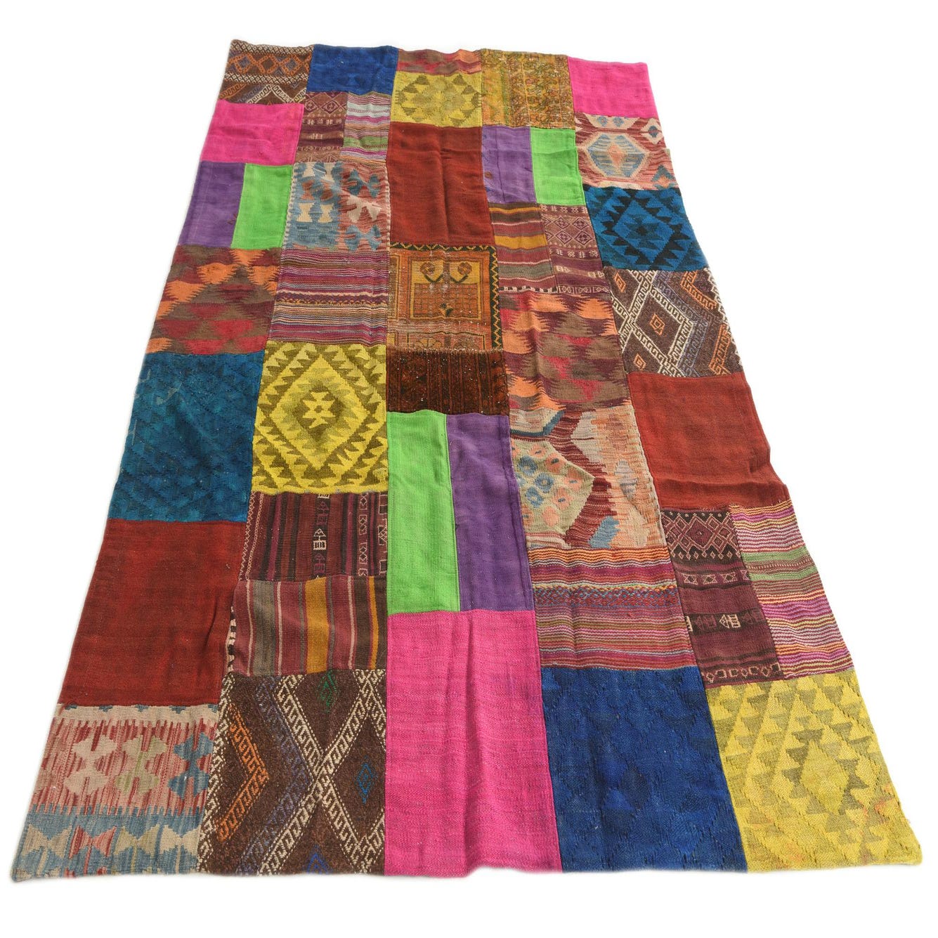 Due to the rug's colorful nature and eye-catching design, it would be well-suited to interiors seeking a focal point or splash of color. This rug could complement a minimalist modern decor by injecting personality and warmth, or it might seamlessly blend into a bohemian or eclectic styled space that celebrates a mix of patterns and colors. The Kilim Patchwork rug can anchor a living room, add vibrancy to a quiet bedroom, or invigorate a home office with its spirited palette and design.
