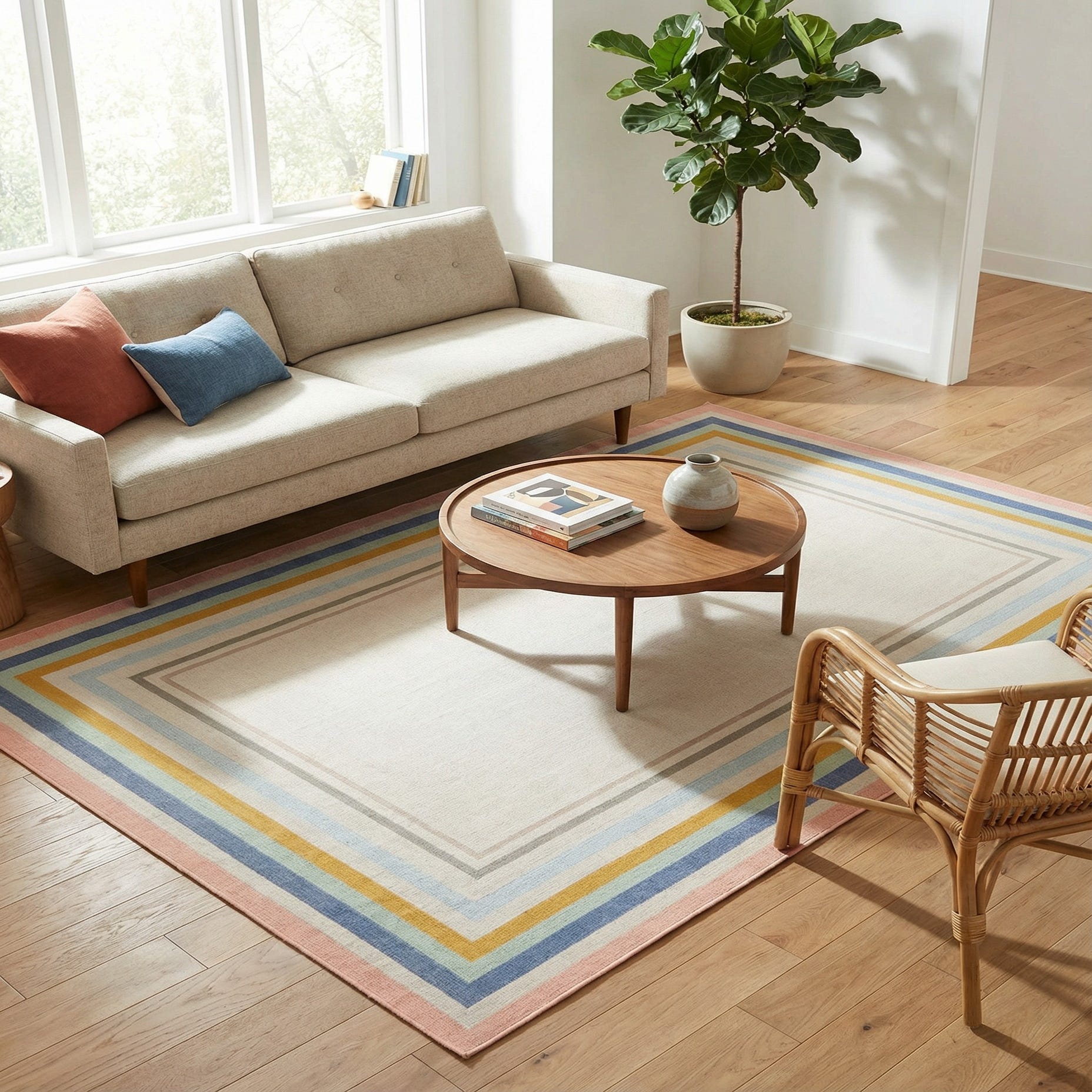 A clean, modern border design gives this rug a calm, collected presence. A broad ivory field is framed by a series of narrow, concentric bands in soft pink, light and deeper blues, gold, gray and light brown, creating a layered, multi-hued background that reads both fresh and refined. The linear pattern and balanced color mix lean contemporary with a hint of transitional versatility, making it easy to pair with a range of furnishings.