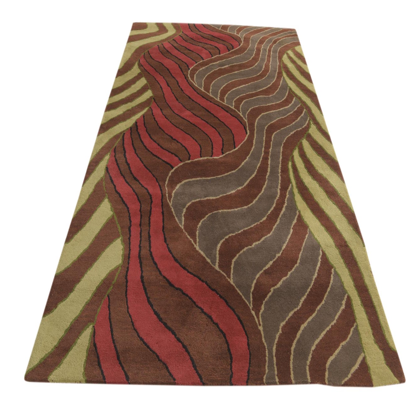 A 5x8 rectangular Luna rug with a modern abstract pattern in multi-colored wool, featuring bold wavy stripes of red, brown, and olive green.