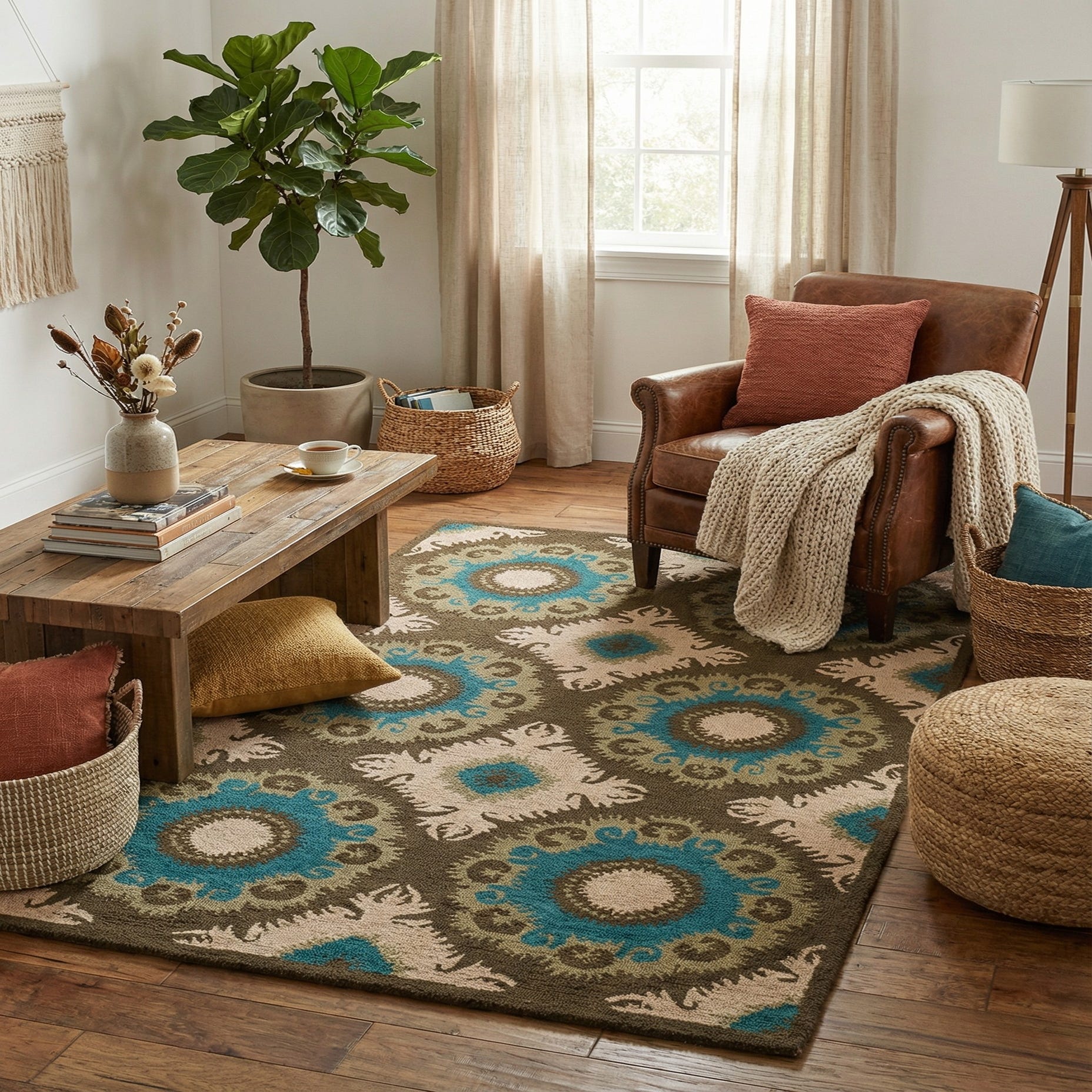 The texture of this wool rug is naturally resilient and offers a soft surface underfoot. The bold patterning adds a dynamic element to any space, making it a fitting choice for a variety of interiors. This rug can serve as an anchoring piece in a living room with neutral furniture, allowing its vivid colors to stand out. Alternatively, it could complement a bohemian or eclectic styled room, blending with decorative accents that carry similar colors or organic motifs.