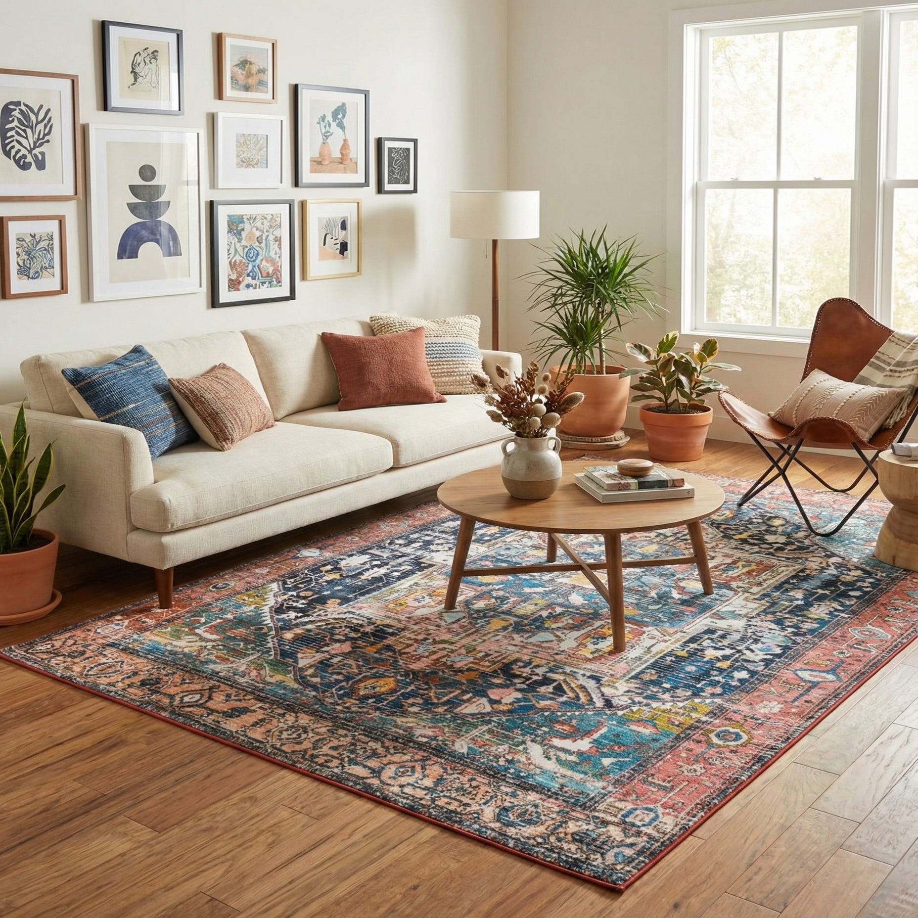 This rug works well to anchor a seating area in a living room, add color beneath a bed in a bedroom, or bring pattern into an entry or dining area. It pairs naturally with navy or neutral sofas, warm wood furniture and brass or matte metal accents, and complements both contemporary and traditional interiors when layered with simple textiles or woven throws.