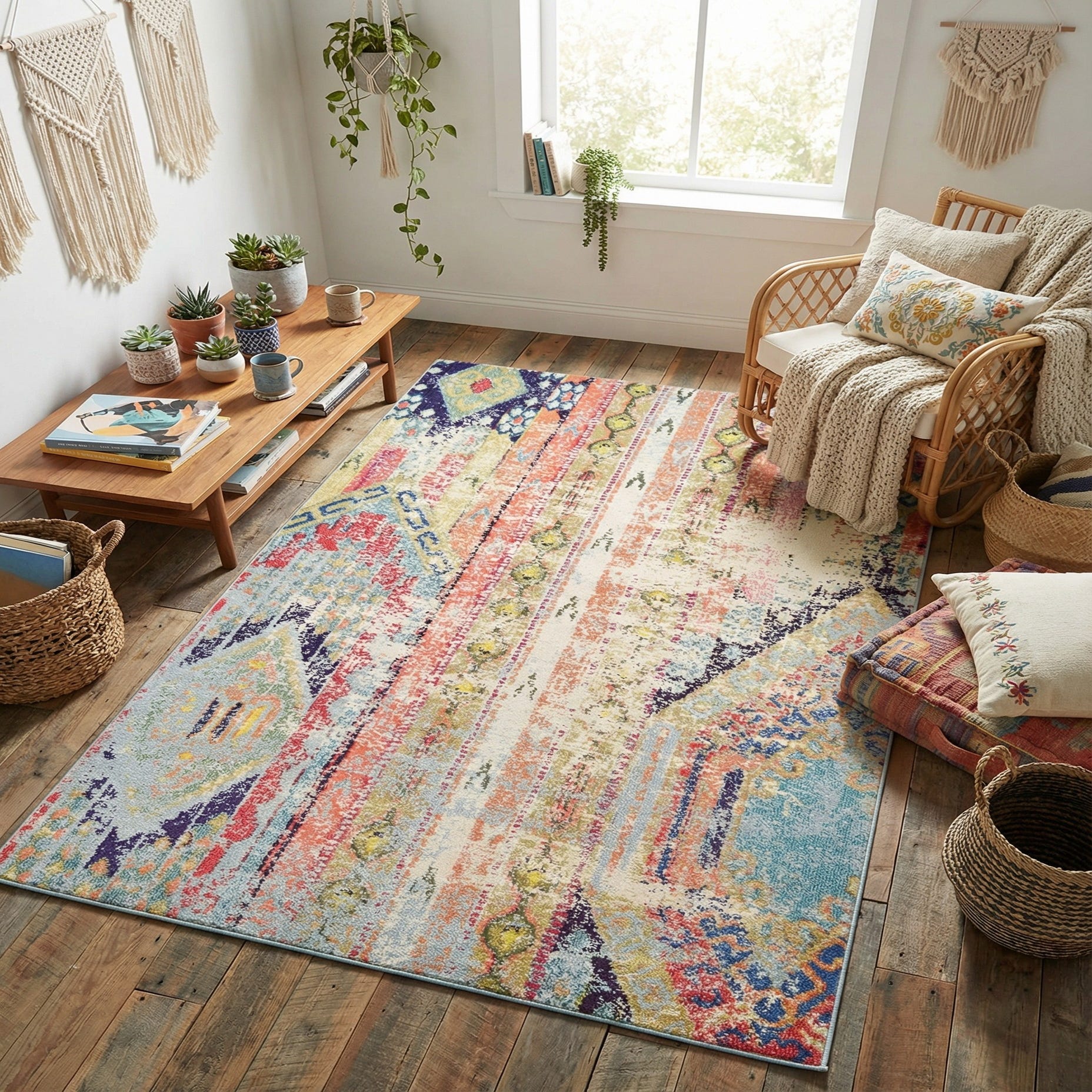 This rug works well to anchor a casual living room or brighten a neutral seating area, bringing warmth and pattern without overwhelming the space. It pairs naturally with midcentury and bohemian furnishings, layered textiles, or clean-lined modern pieces when you want a playful color story. Place it beneath a coffee table to define a conversation zone, at the foot of a bed to introduce color and texture, or in a home office to add visual interest and a welcoming touch.