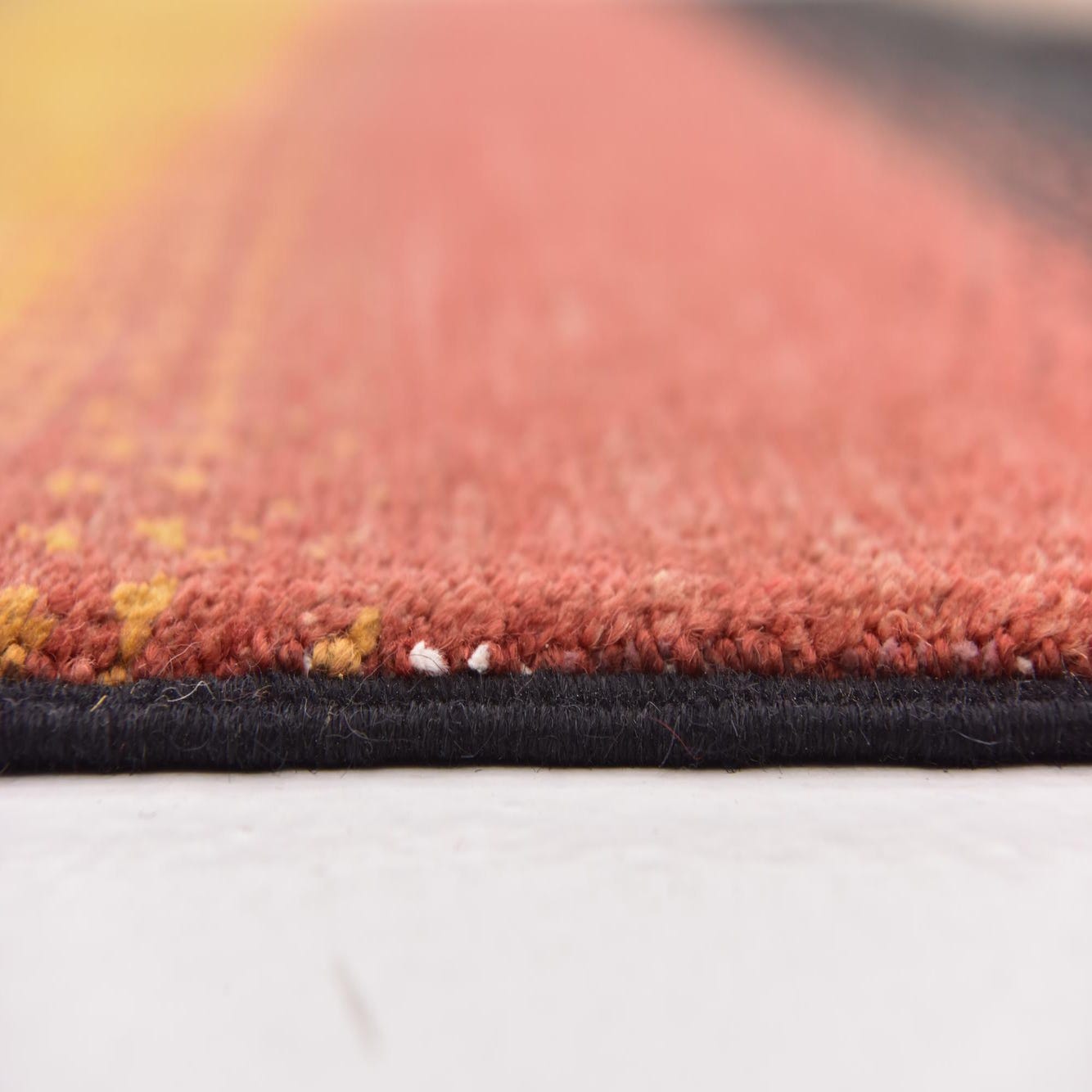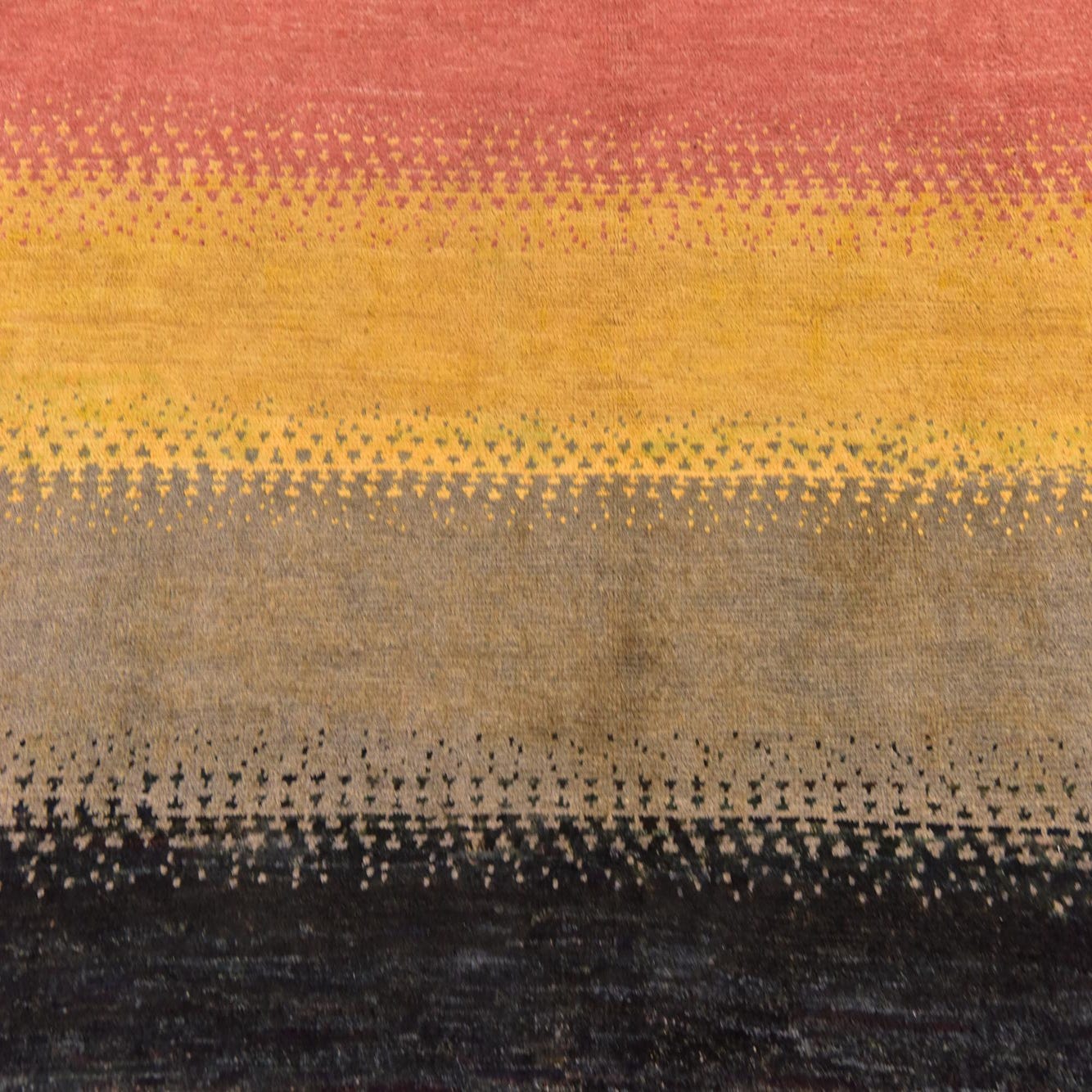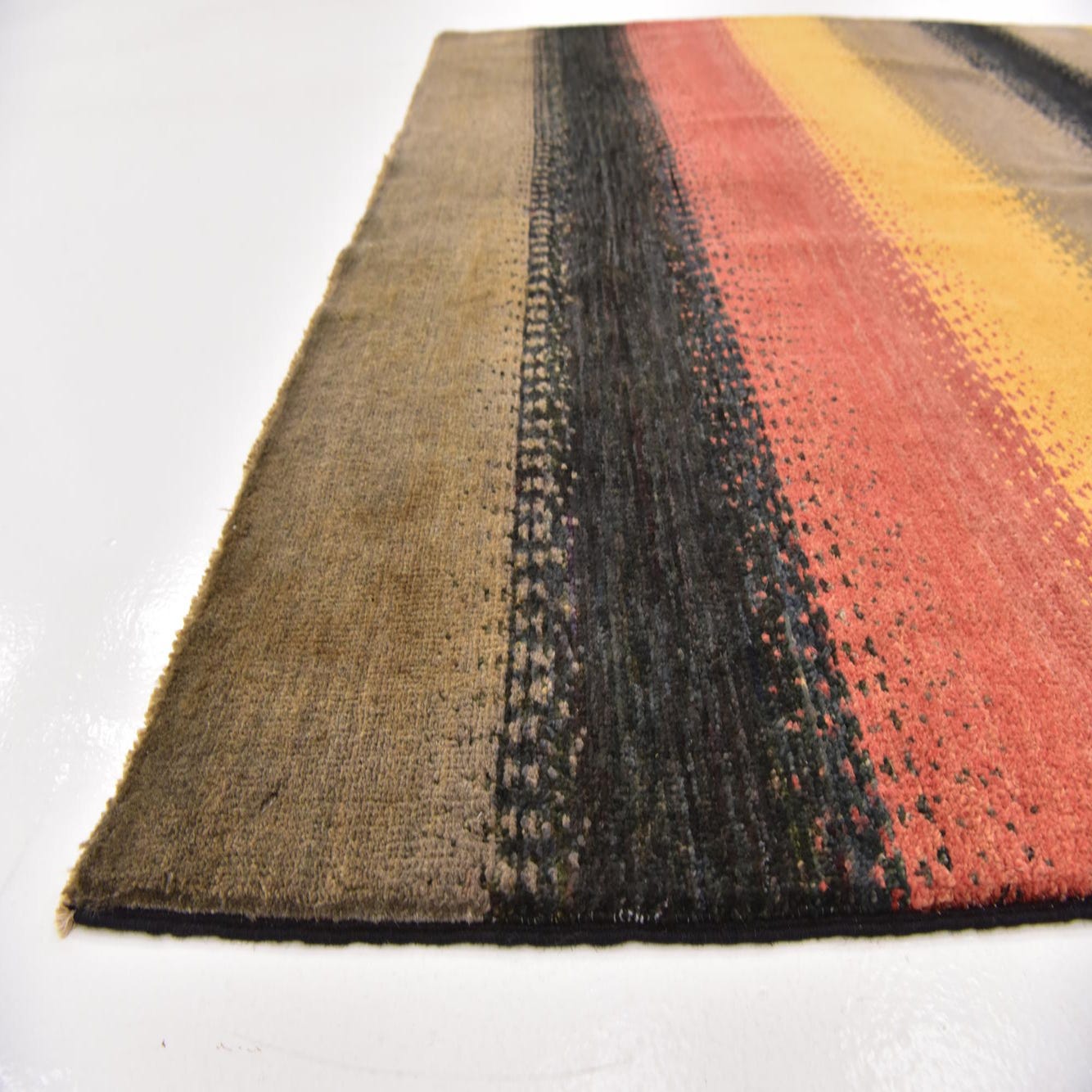 A rectangular 5x8 Modern Ziegler rug with horizontal stripes in shades of brown, black, yellow, and red, featuring a textured, thin pile.