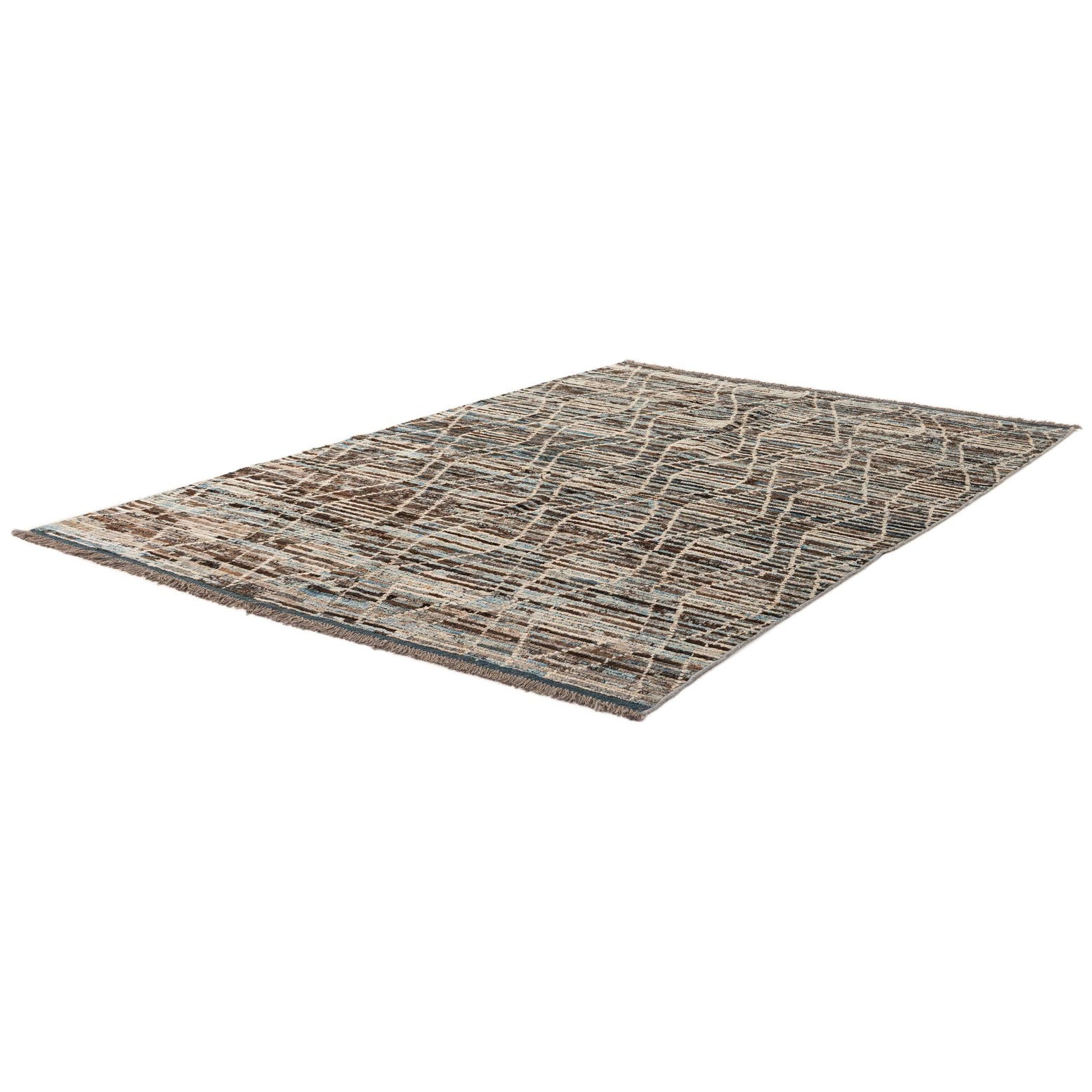 A 5x8 rectangular Moroccan tribal rug with a multi-colored diamond pattern in blues, browns, and creams.