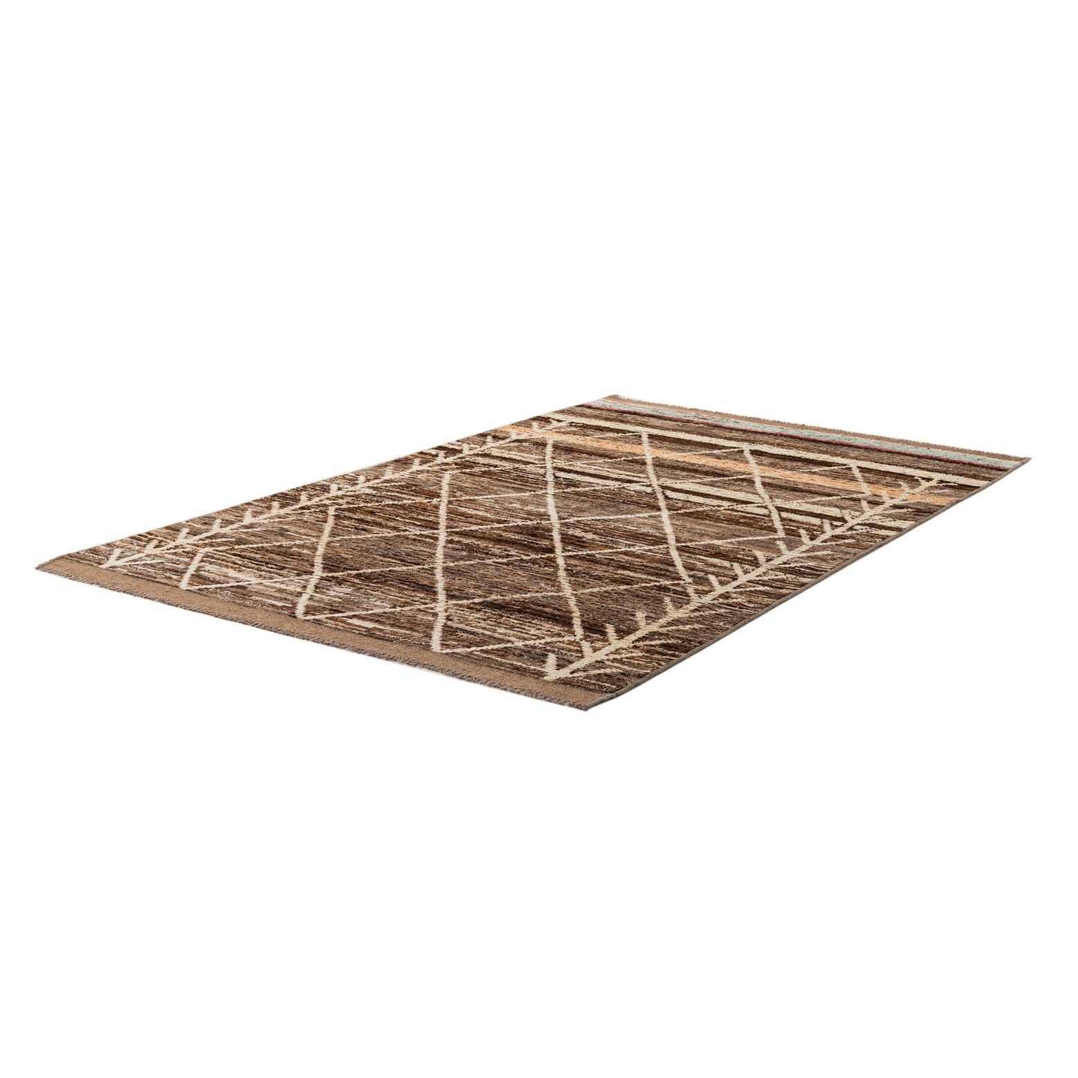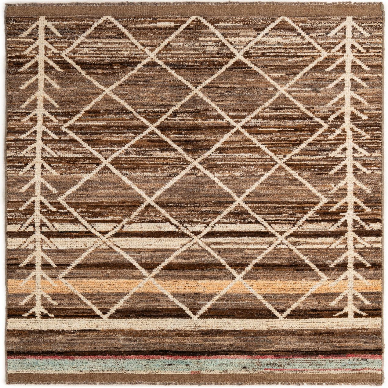 A 5x8 rectangular Moroccan wool rug featuring a tribal diamond pattern in multi-colored brown, beige, and subtle blue tones.