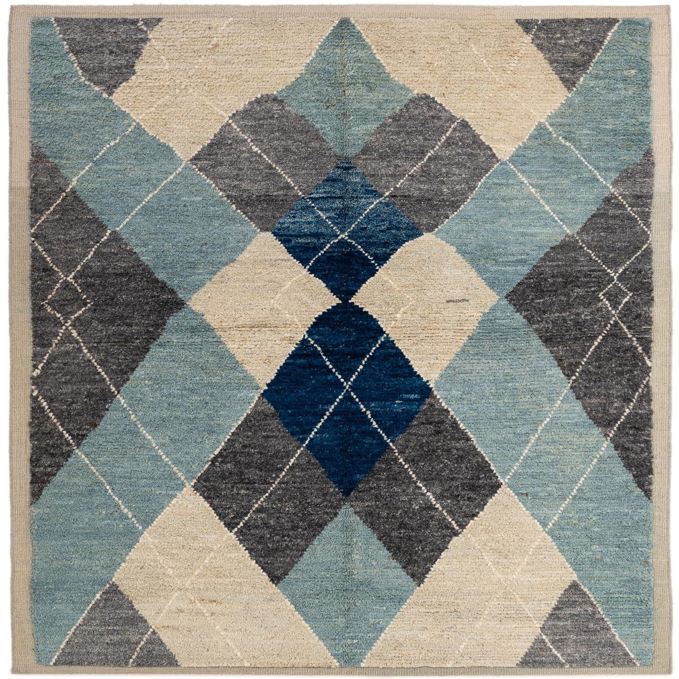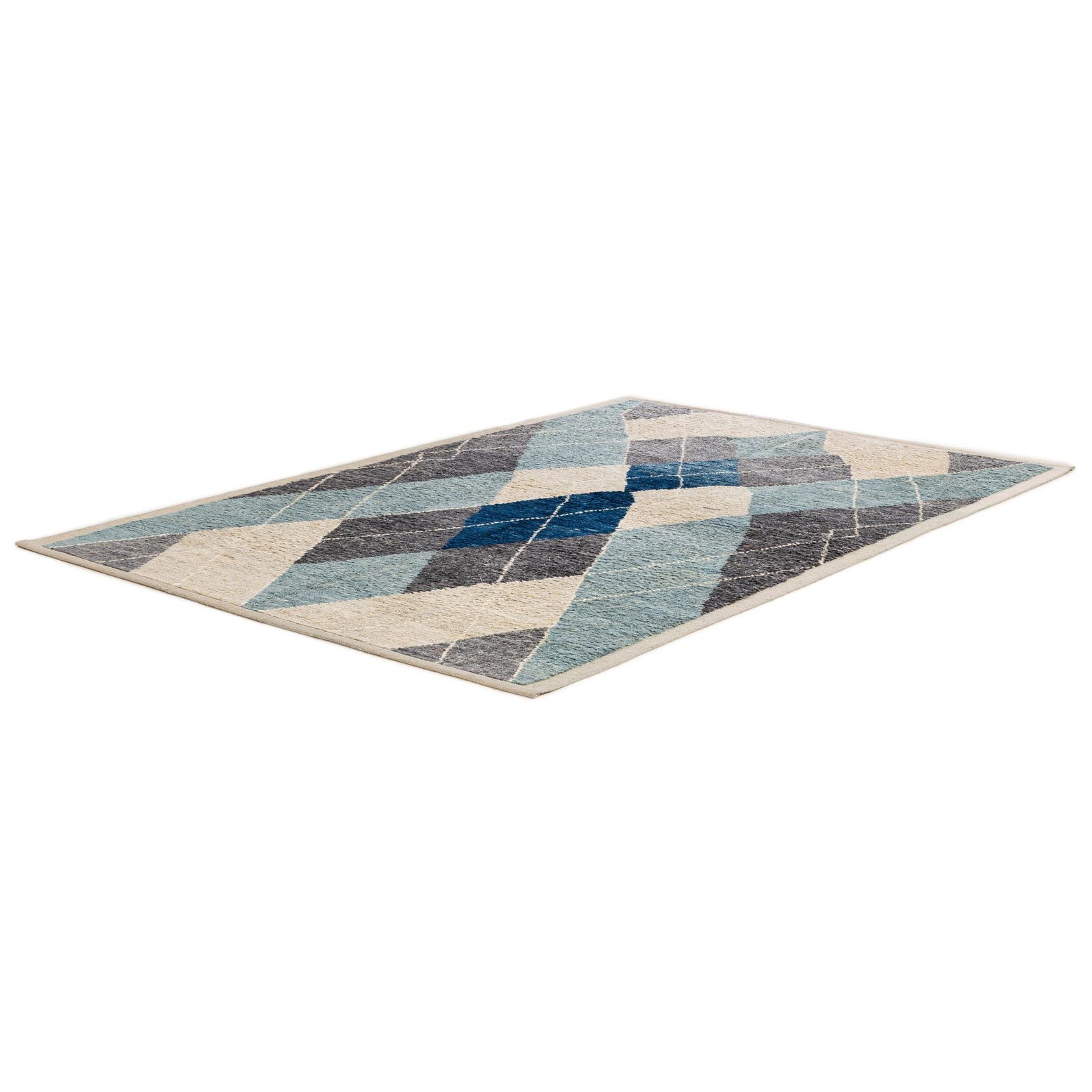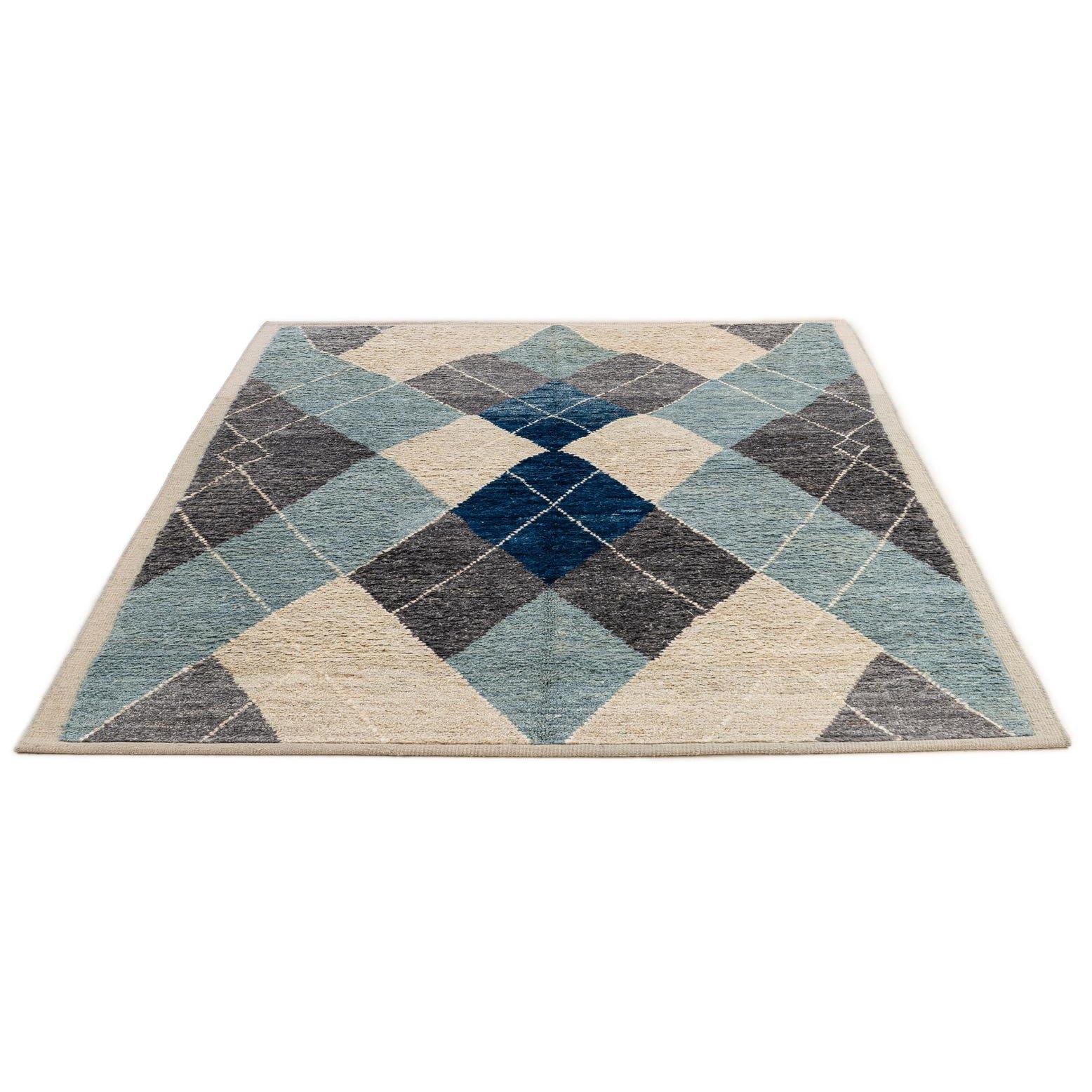 A 5x8 rectangular Moroccan wool rug featuring a large argyle pattern in shades of blue, gray, and cream.
