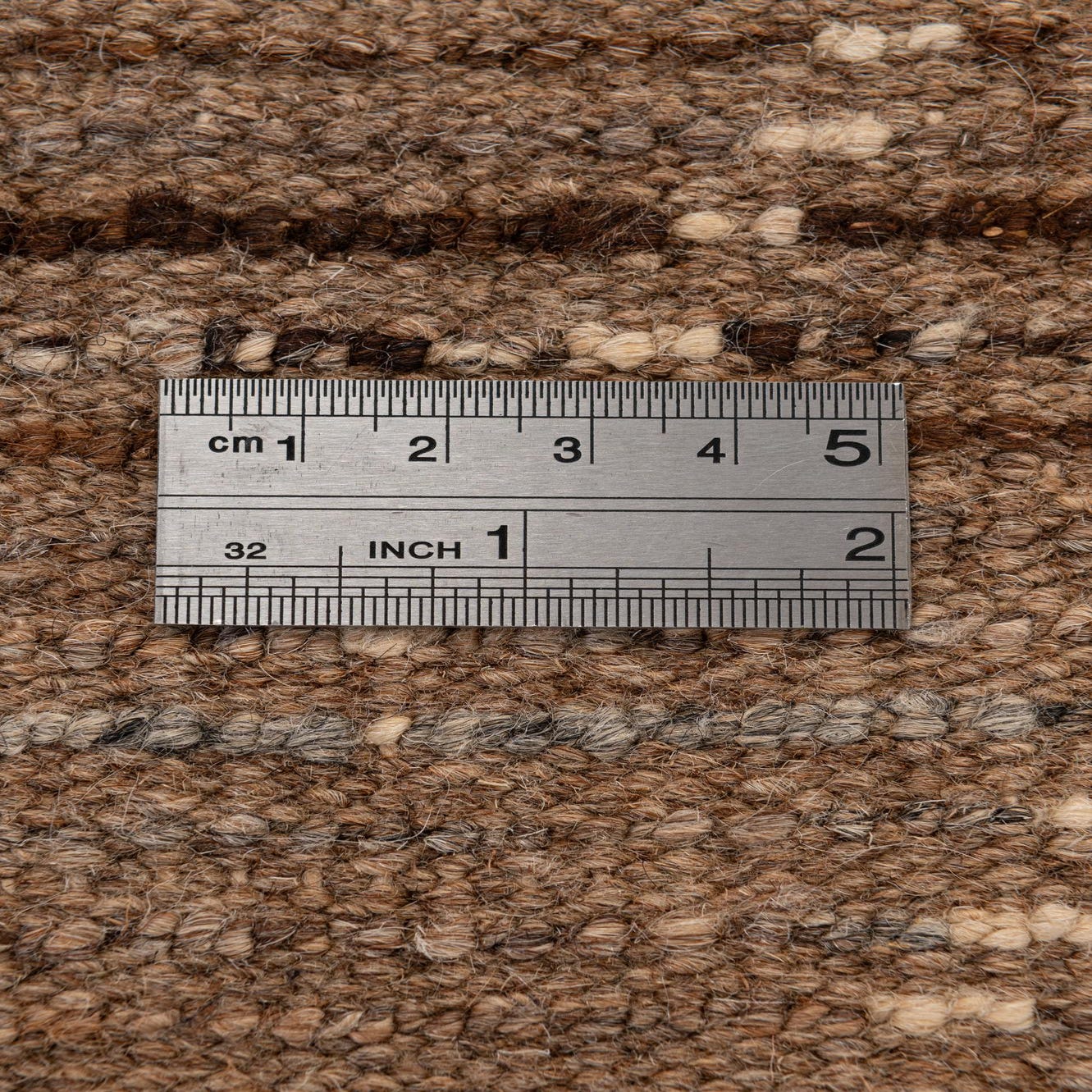 A 5x8 rectangular wool rug with a multi-colored striped background in browns and creams, featuring a white tribal geometric pattern and light blue and red bands at the top.