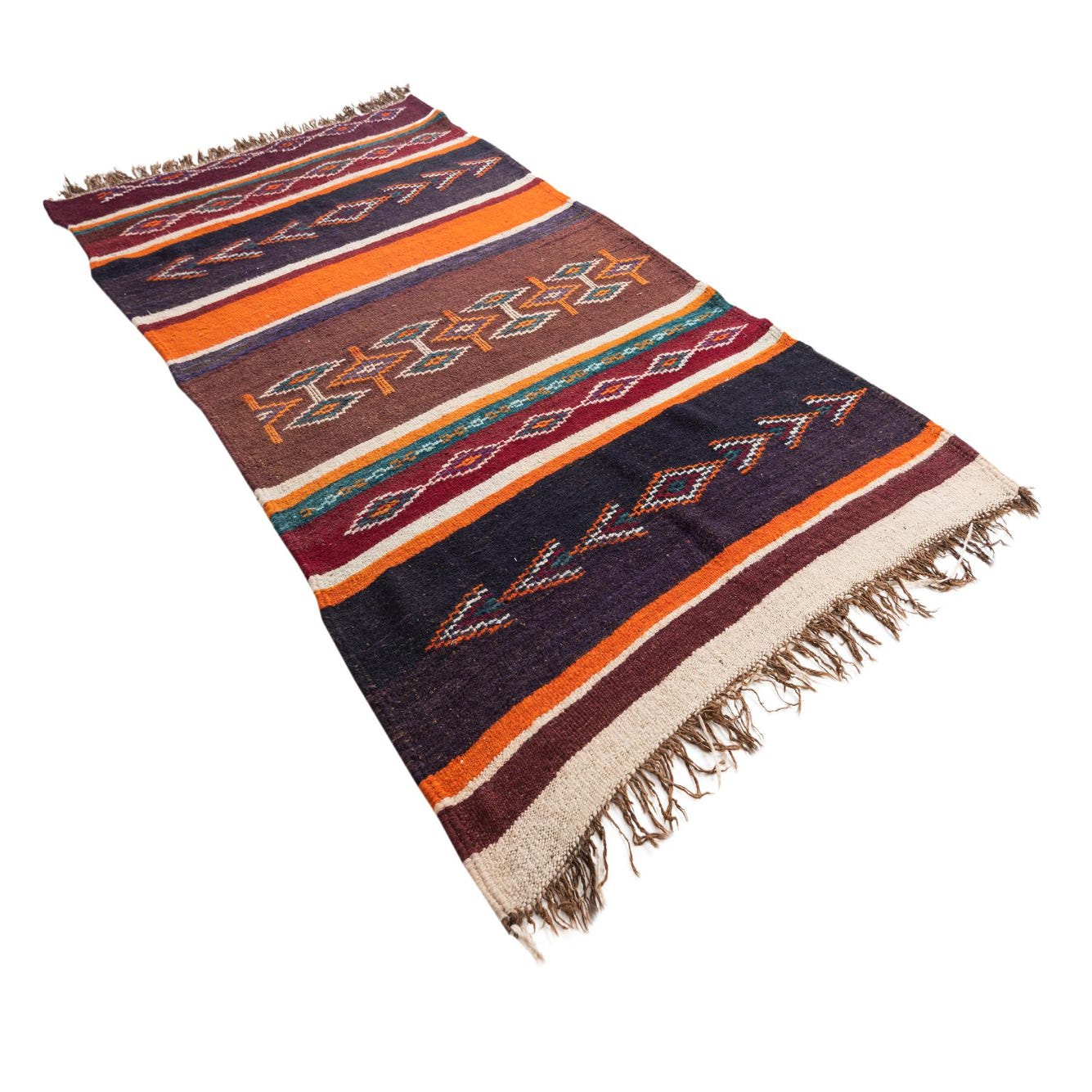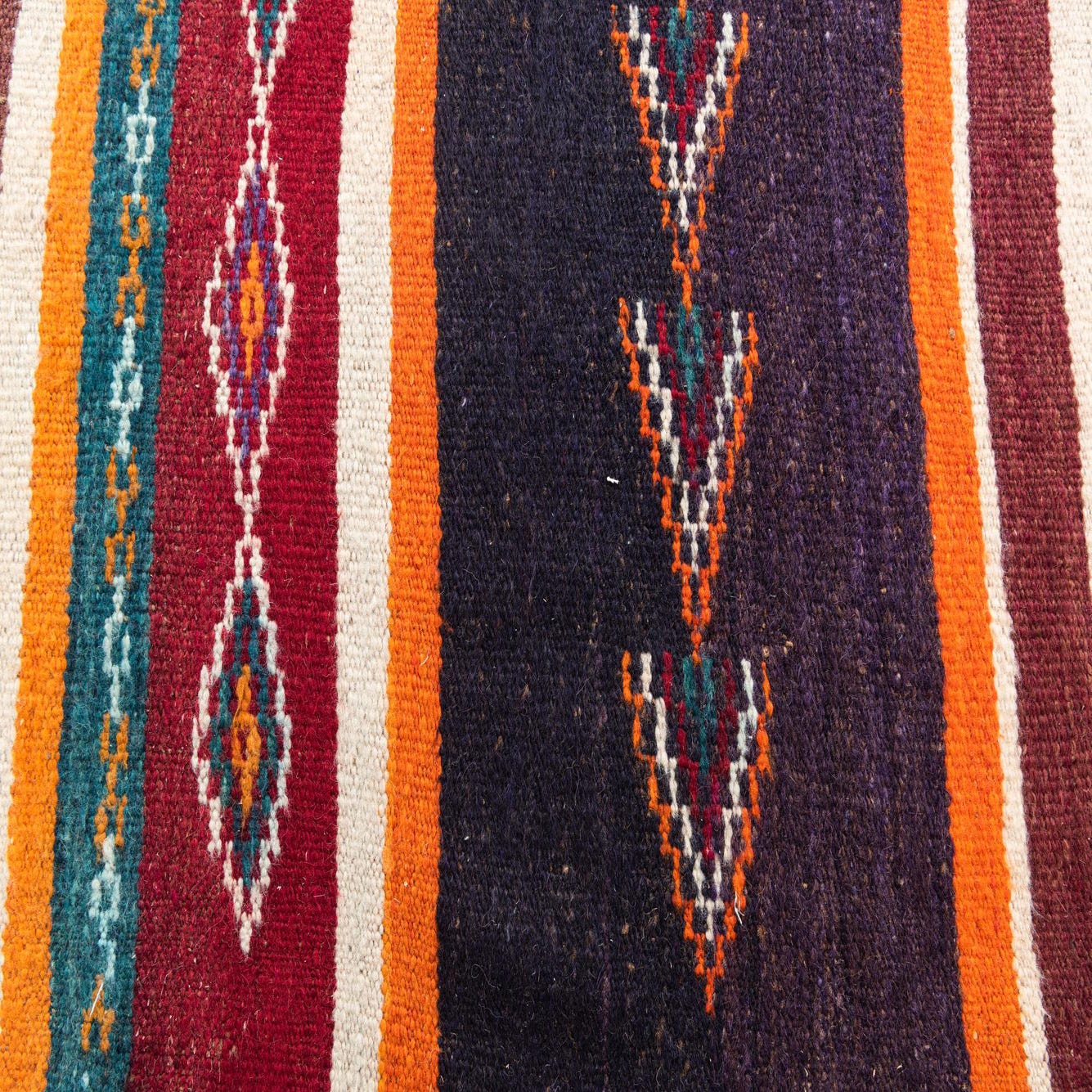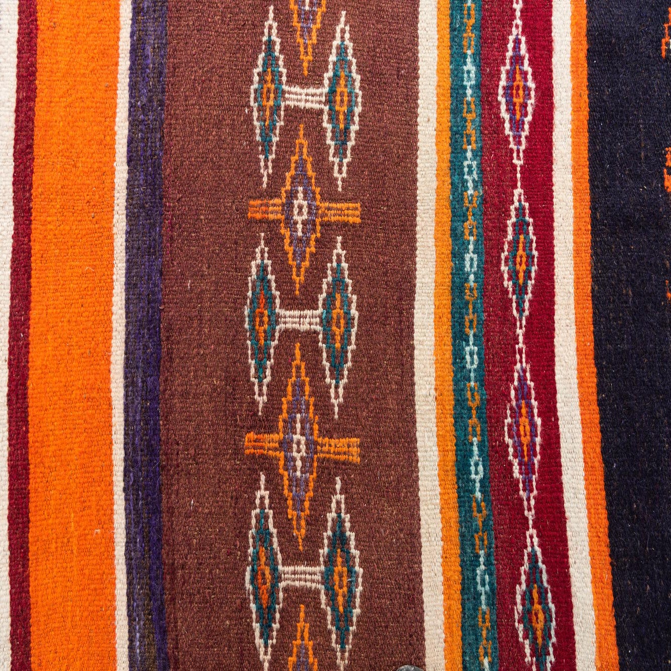 Hand-knotted in 100% wool, this rug presents a series of horizontal bands punctuated by geometric motifs — diamond lozenges, paired chevrons and repeating medallions — arranged in an orderly, rhythmic layout. The background is multi, with a palette that includes ivory, navy blue, orange, red, turquoise, violet and maroon; deep fields sit next to bright orange and ivory stripes for clear, layered contrast. The wool surface is dense and slightly nubby to the touch, with a springy firmness underfoot and short fringed ends that give the piece a relaxed, handcrafted finish.