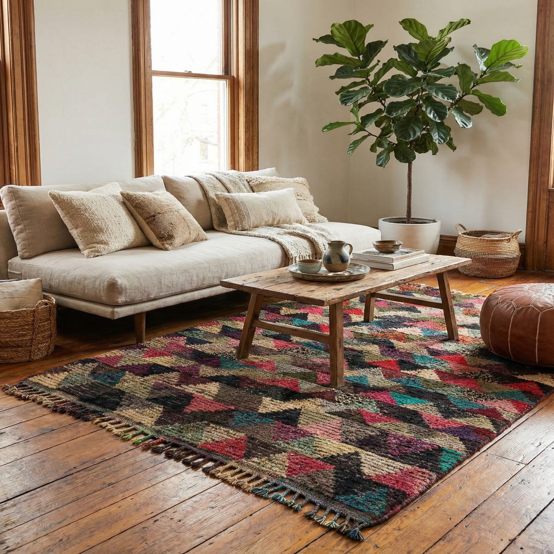 This rug would be particularly well-suited for spaces that embrace eclectic or bohemian styles, as its rich color scheme and lively patterns pair well with a variety of textures and furnishings. It can also serve as a focal point in more minimalist or contemporary settings where a pop of color and pattern can add depth and interest. Whether anchoring a living room, adding character to a bedroom, or warming up a home office, this Moroccan-inspired rug is a compelling choice for those looking to introduce a touch of artisanal craftsmanship into their decor.