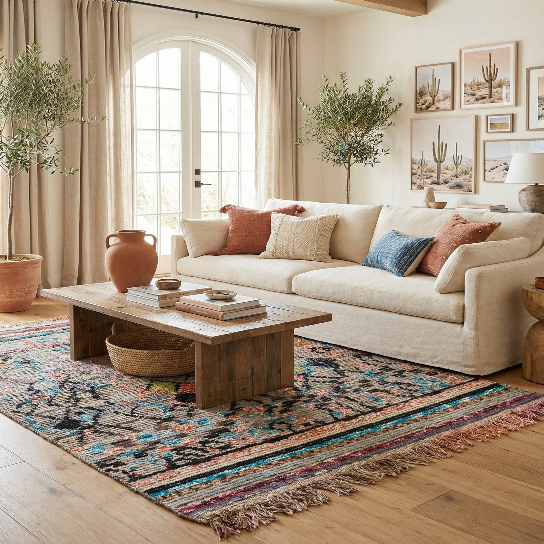 This rug works well in relaxed, creative interiors: place it beneath a low coffee table in a bohemian living room to tie together mixed textiles and plants, or use it to add color and texture to a modern or mid-century seating arrangement. It also complements soft, neutral bedrooms when layered over hardwood or a larger natural-fiber runner, and it can anchor an entryway or reading nook where a hand-crafted, collected look is desired.