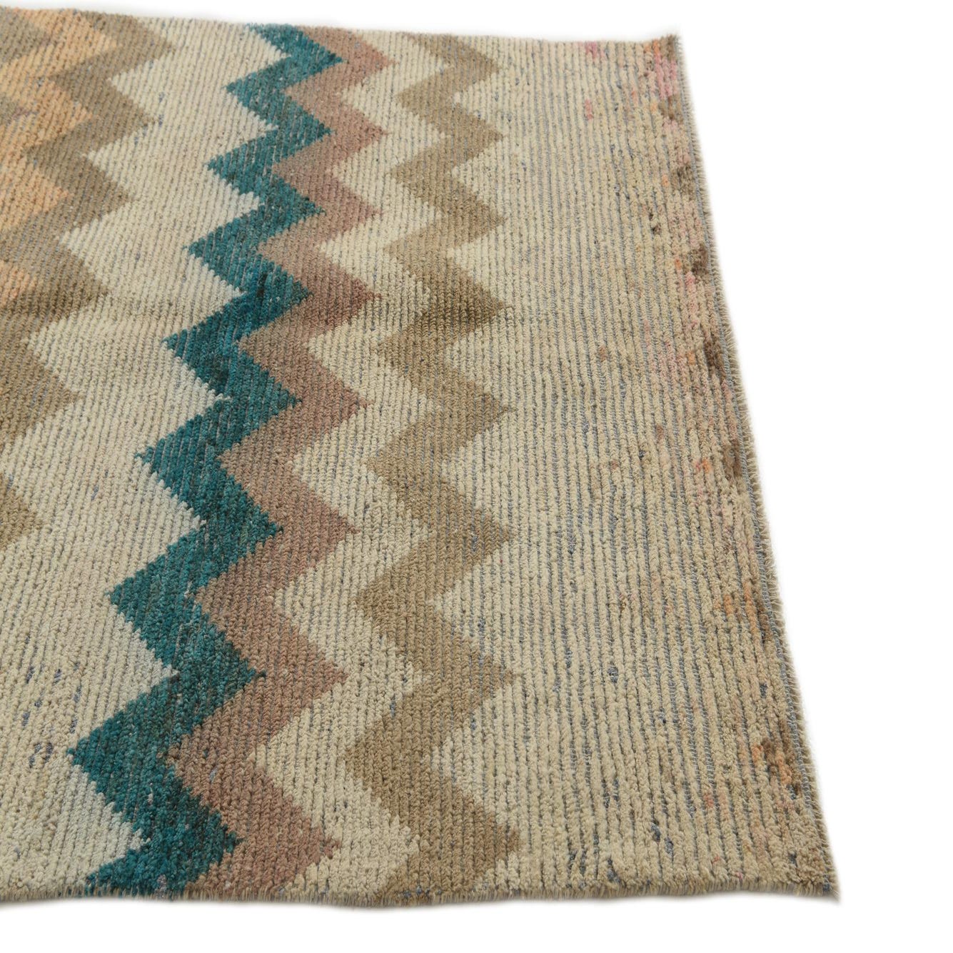 A 5x8 rectangular Moroccan shag rug with a multi-colored zigzag pattern in beige, brown, orange, and teal.