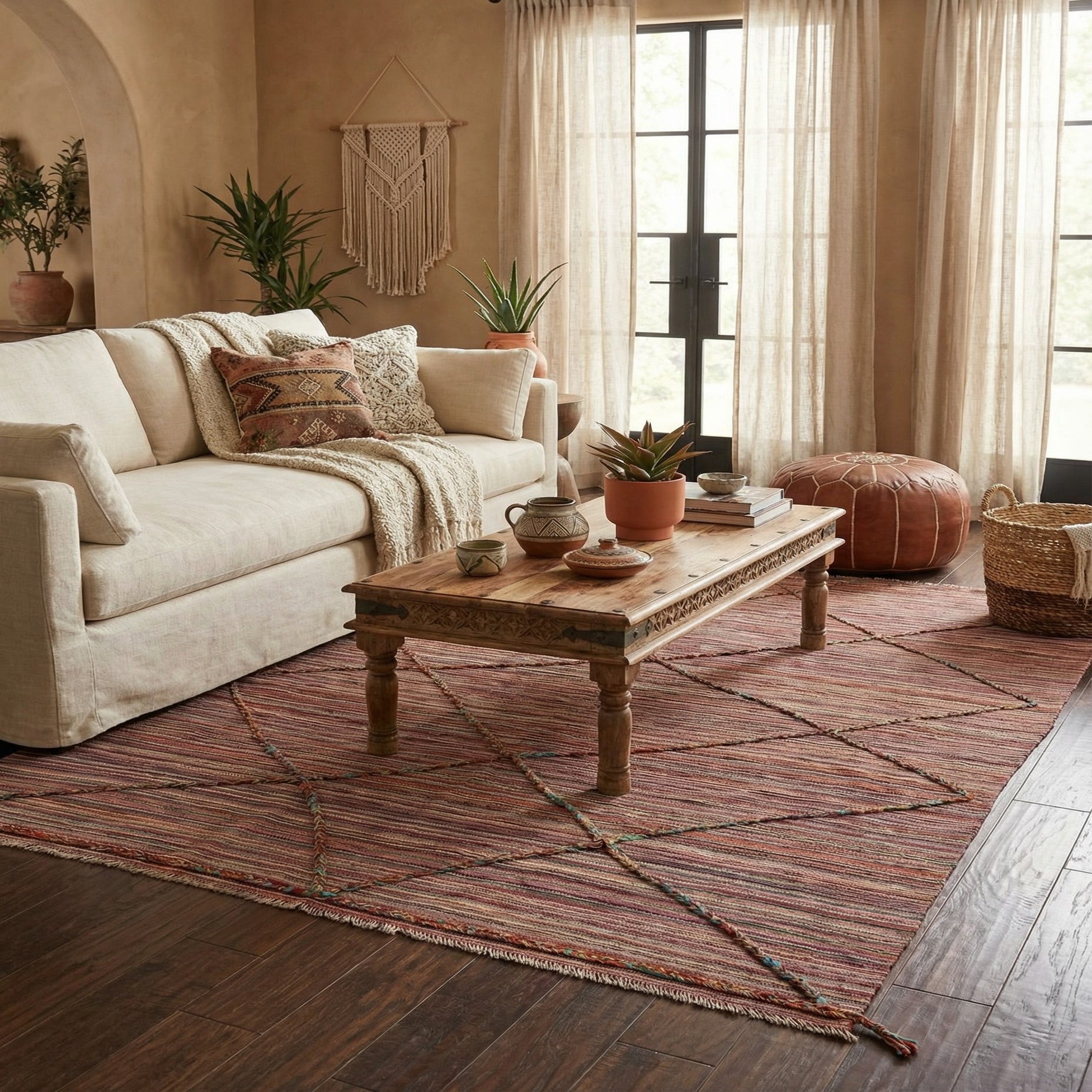 The pattern features a unique blend of color with a predominantly linear, geometric motif that provides a contemporary twist on traditional Moroccan designs. The added fringe elements at each end introduce a casual, yet polished aesthetic. This rug may be well-suited to a variety of interior design scenarios including modern, eclectic, or global-inspired spaces where it can serve as an artistic statement or a complementary element to your existing decor. The intricate craftsmanship and robust palette make this rug a versatile choice for living rooms, dining areas, or bedrooms where it can anchor furniture and create a warm, inviting atmosphere.