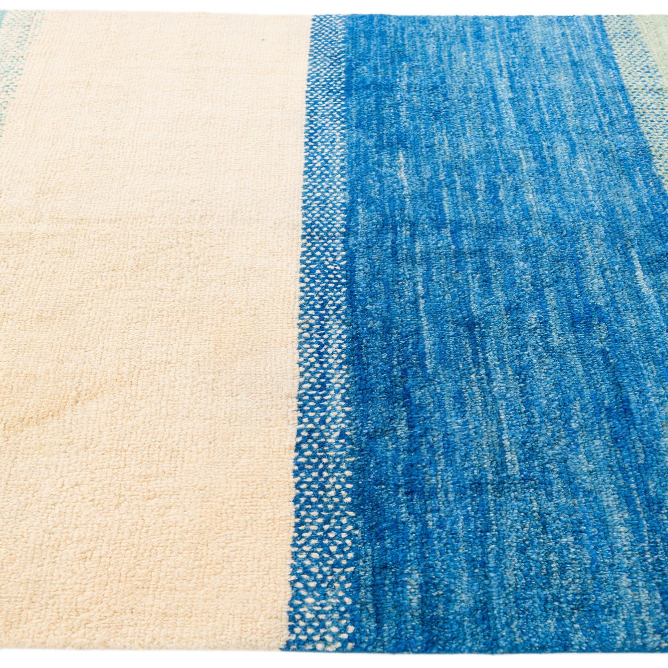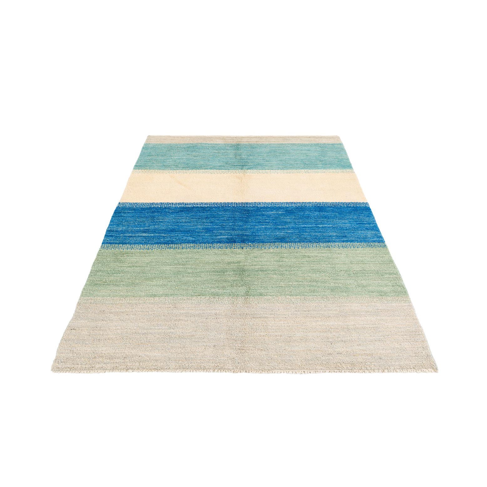 A 5x8 rectangular Moroccan shag rug with wide horizontal stripes in shades of blue, green, and cream.