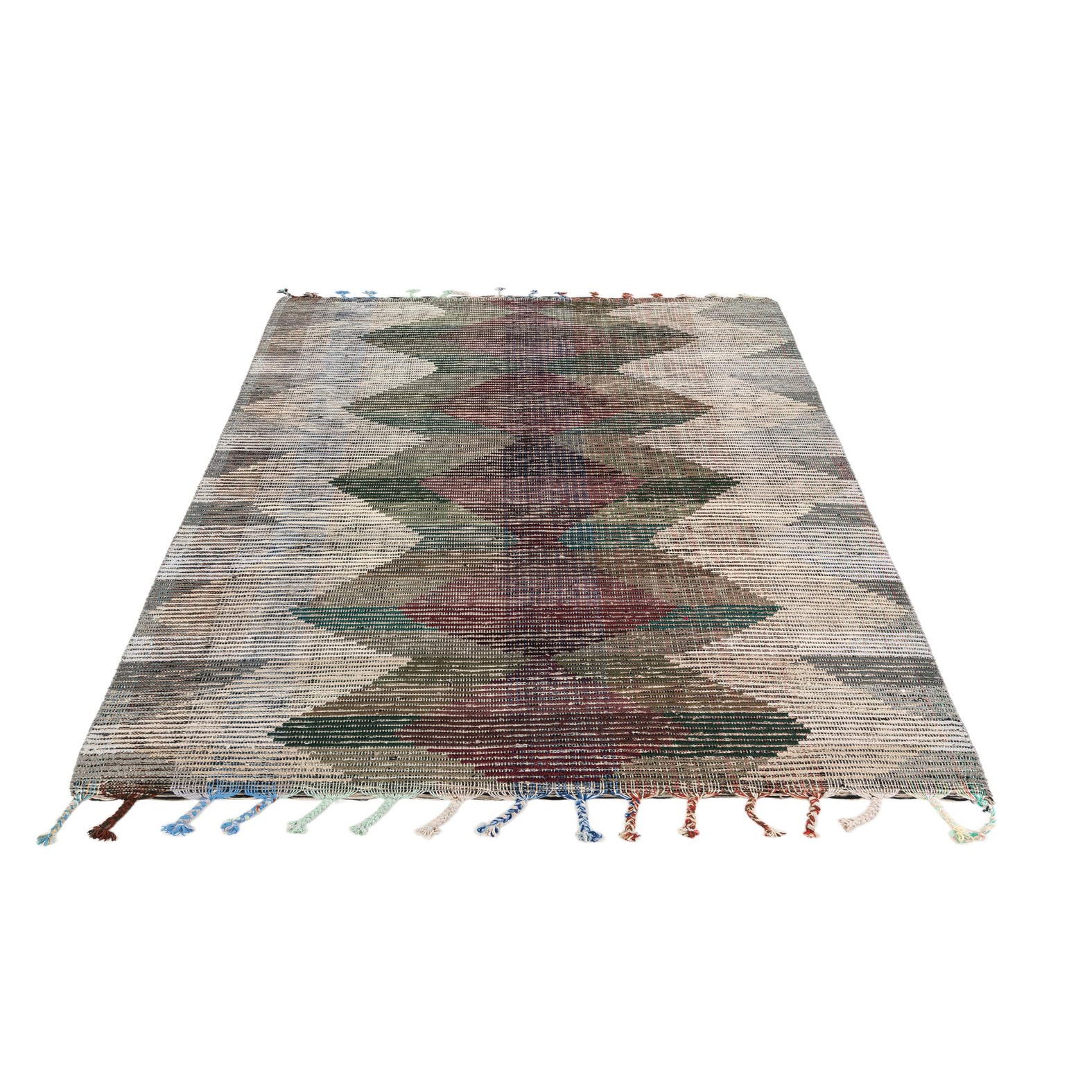 A 5x8 rectangular multi-colored tribal shag rug with large geometric diamond patterns and colorful tassels.