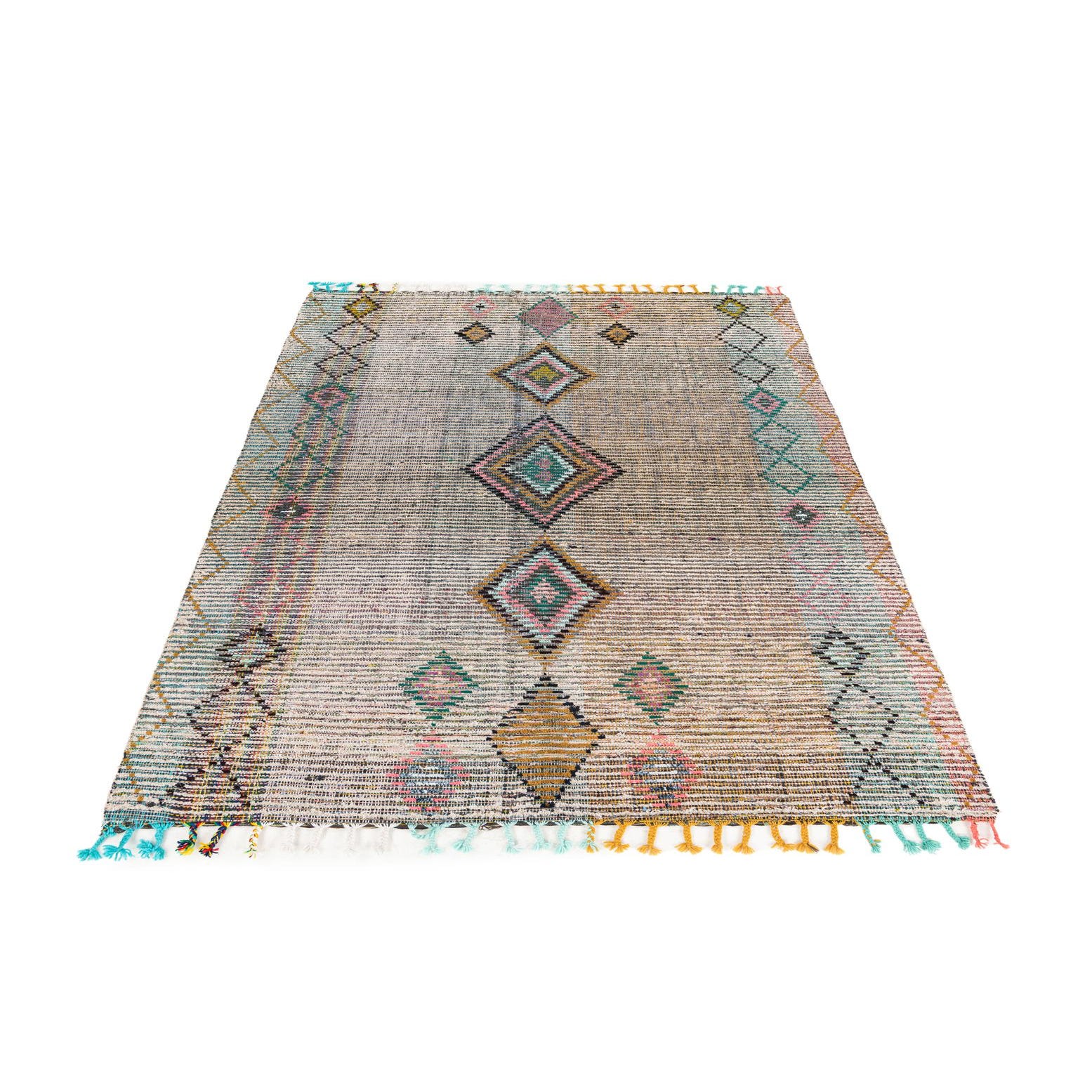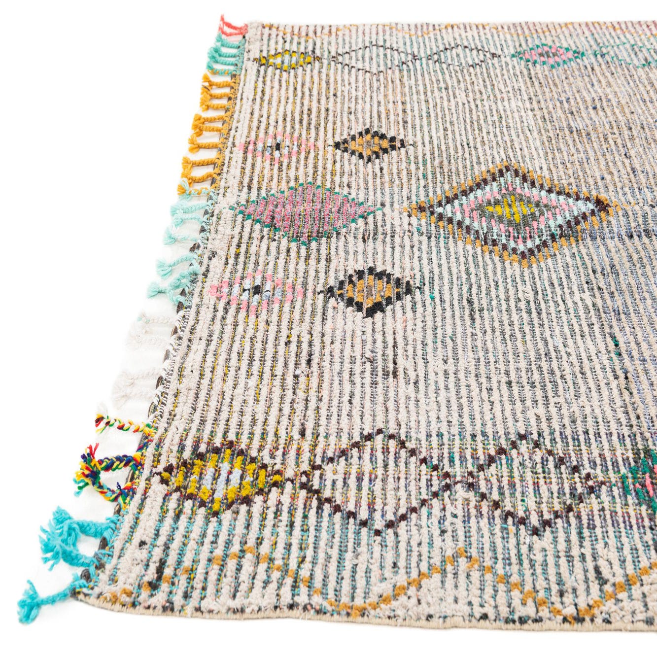 A 5x8 rectangular multi-colored tribal shag rug with large geometric diamond patterns and colorful tassels.