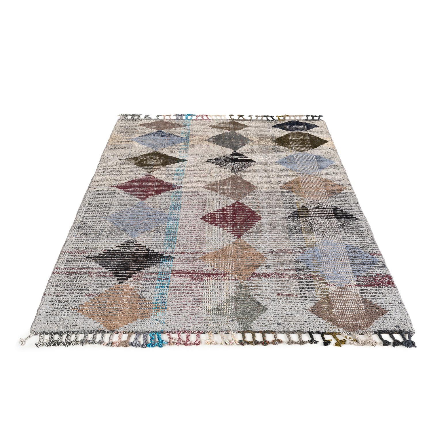 A 5x8 rectangular multi-colored tribal shag rug with various diamond patterns and tassels, perfect for a living room.