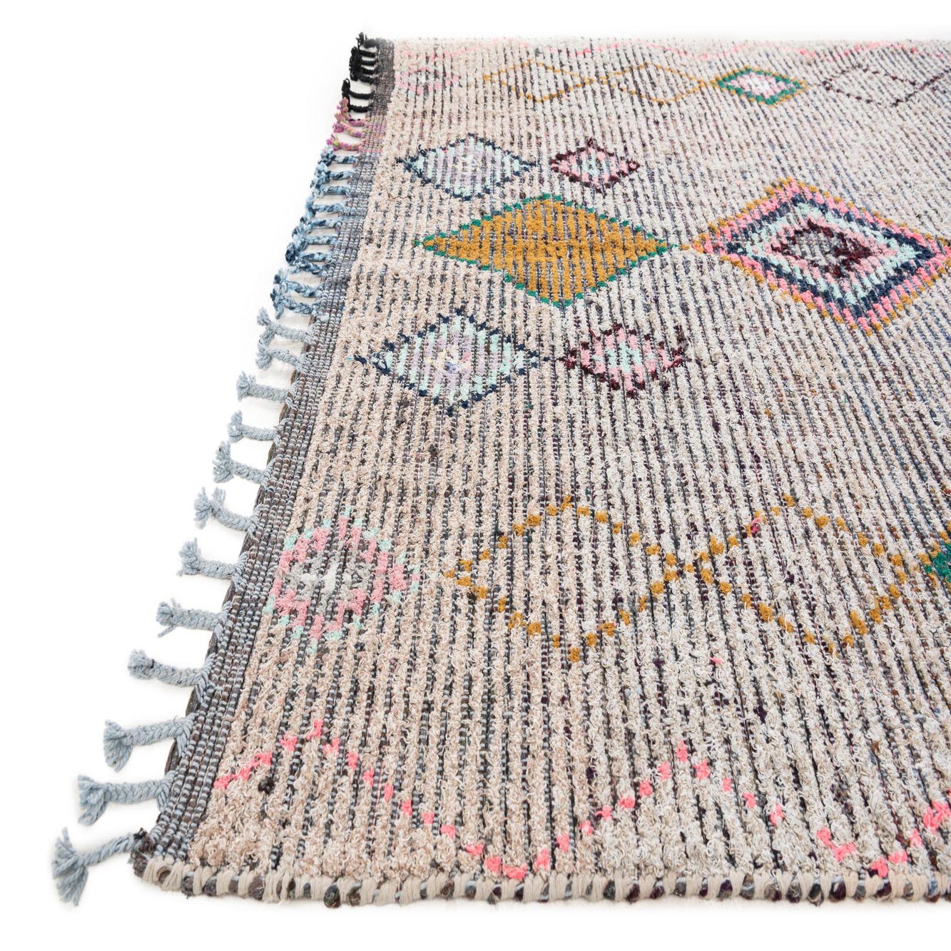 A 5x8 rectangular multi-colored tribal shag rug with a pattern of varying diamond shapes and colorful tassels.