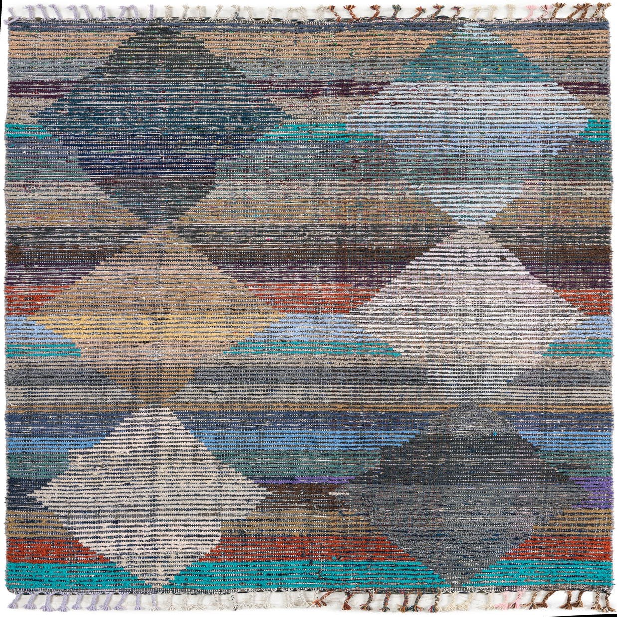 A 5x8 rectangular multi-colored tribal shag rug with a modern abstract pattern and tassels, suitable for a living room.