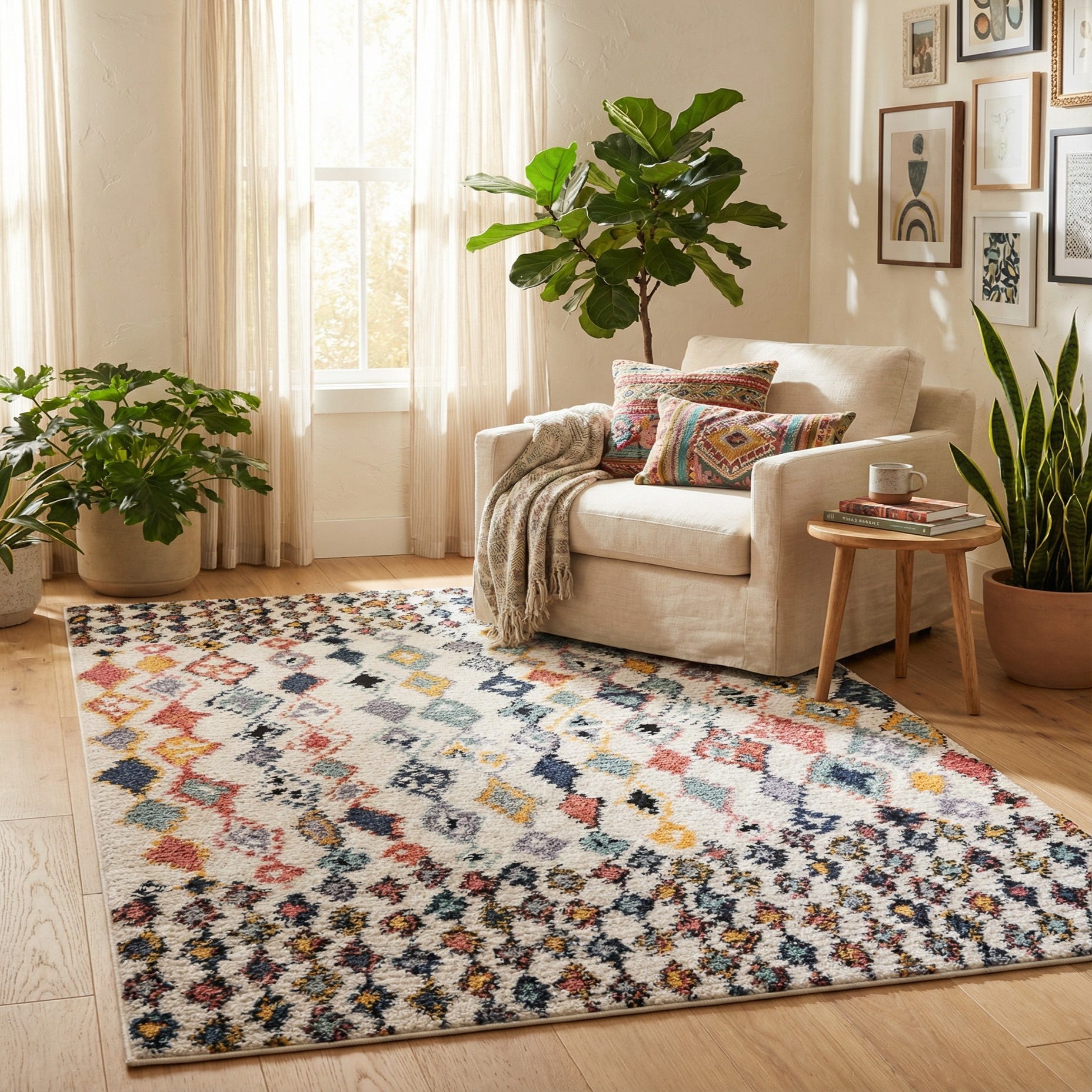 Machine-made from 100% polyester, this rug brings visual interest to a range of interiors. It works well layered beneath a low-profile sofa or under a small seating grouping in a living room, anchors a cozy bedroom arrangement, or adds color and comfort to a home office or reading nook. Pair it with warm wood furniture and matte black metal accents for a modern-bohemian look, or combine it with neutral upholstery and textured textiles to let the rug’s pattern and palette take center stage.
