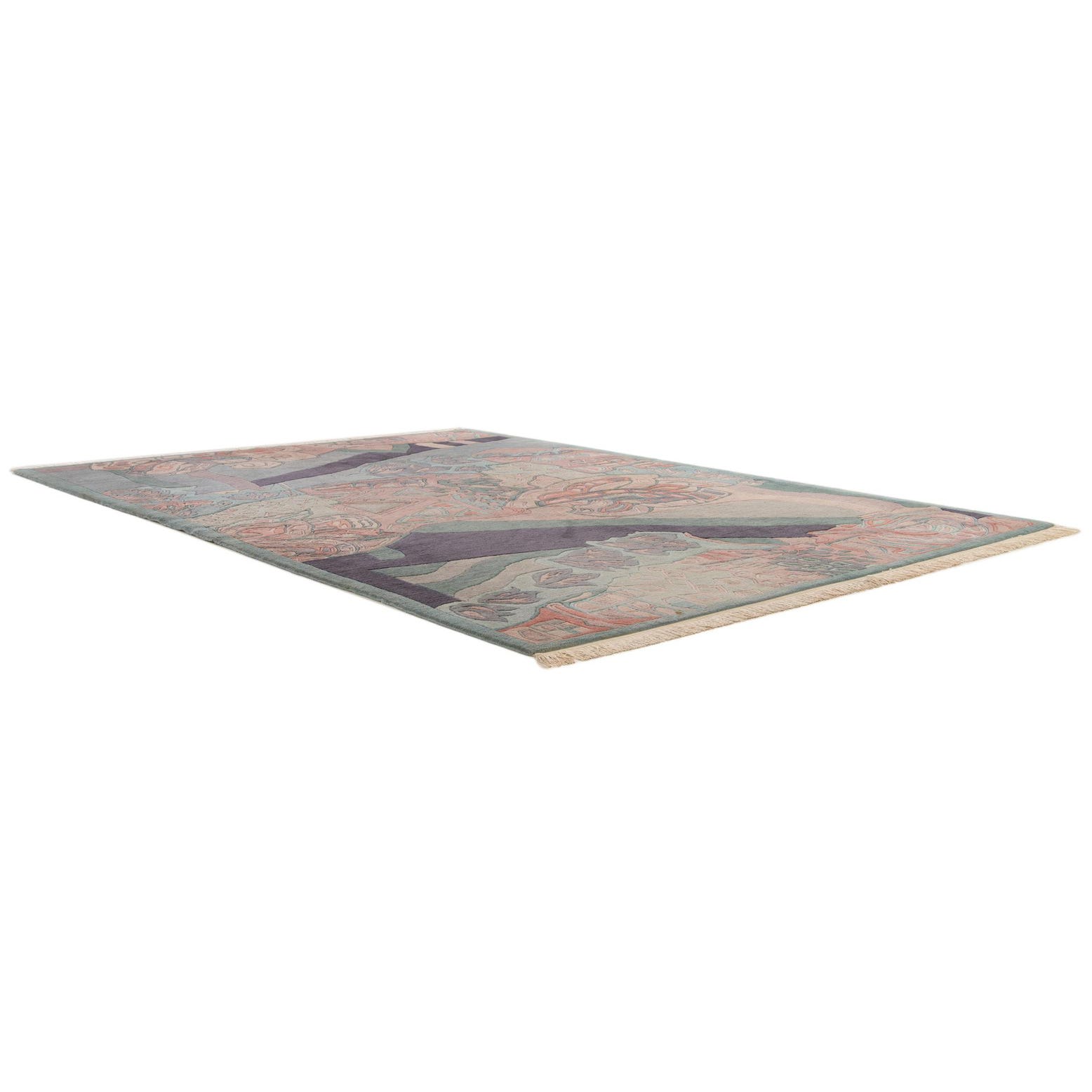 A hand-knotted, 100% wool area rug with an abstract, layered composition of organic and geometric forms. The multi-hued field acts as a soft, shifting backdrop for motifs in beige, light brown, purple, violet, light blue and light green, with darker linear bands that give the design a sense of movement. The pattern balances rounded, petal-like shapes with angular, tessellated elements for a look that sits between contemporary art and a subtle, textural tapestry.