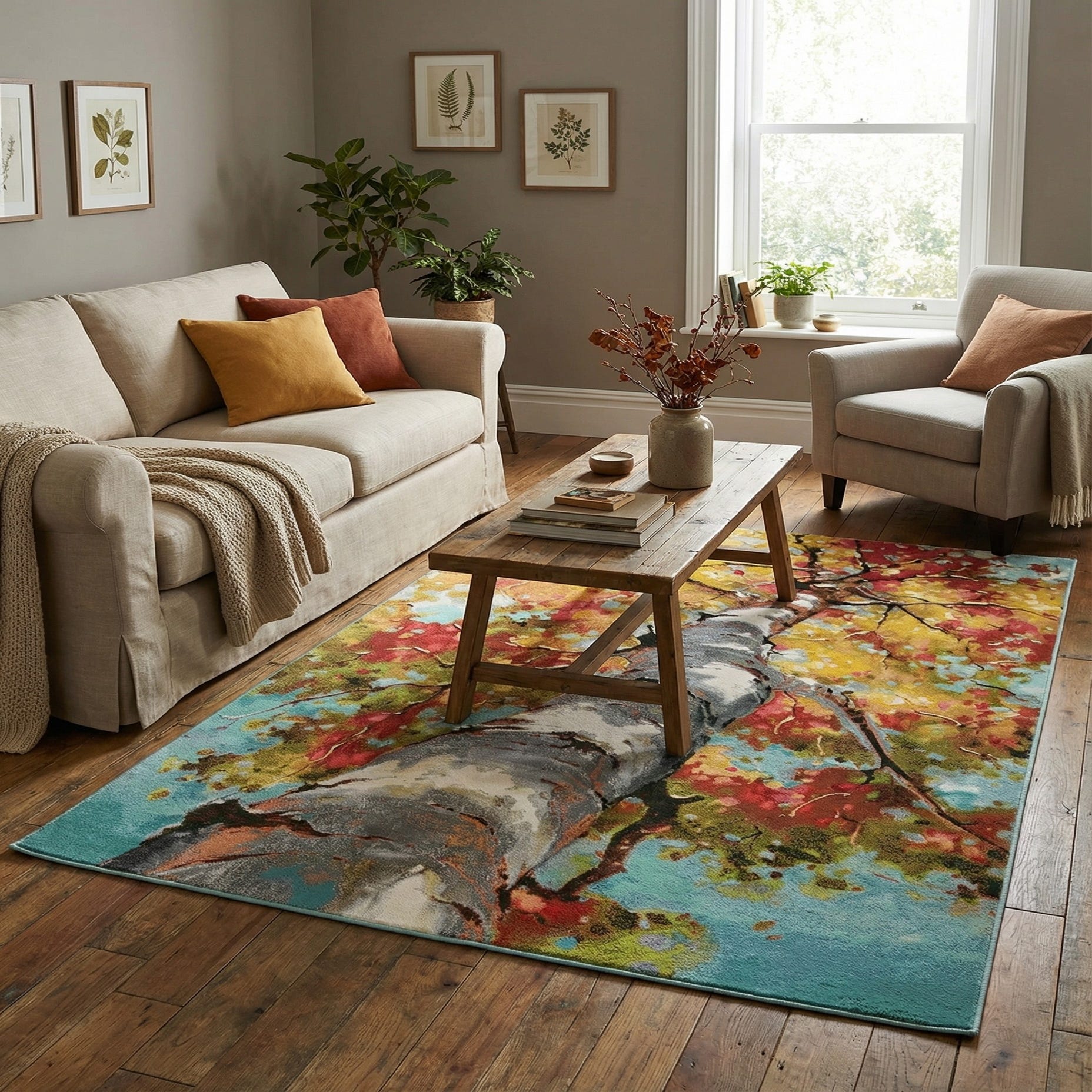 A vibrant 5x8 rectangular rug depicting a birch tree with colorful autumn leaves against a blue sky, suitable for indoor or outdoor use.