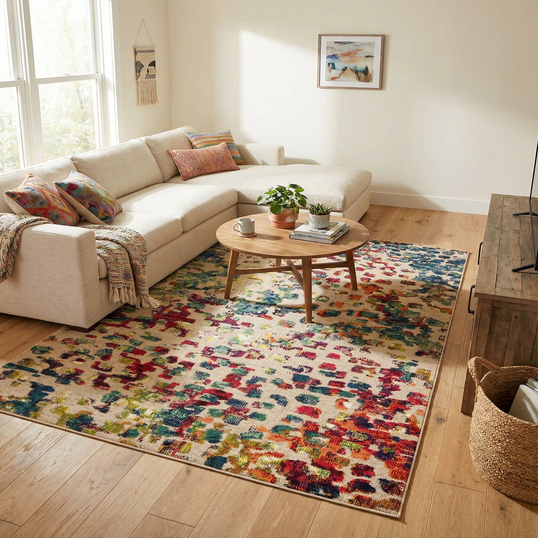 A 5x8 rectangular multi-colored modern rug featuring an abstract pattern of red, blue, green, and yellow squares on a beige background, suitable for indoor or outdoor use.