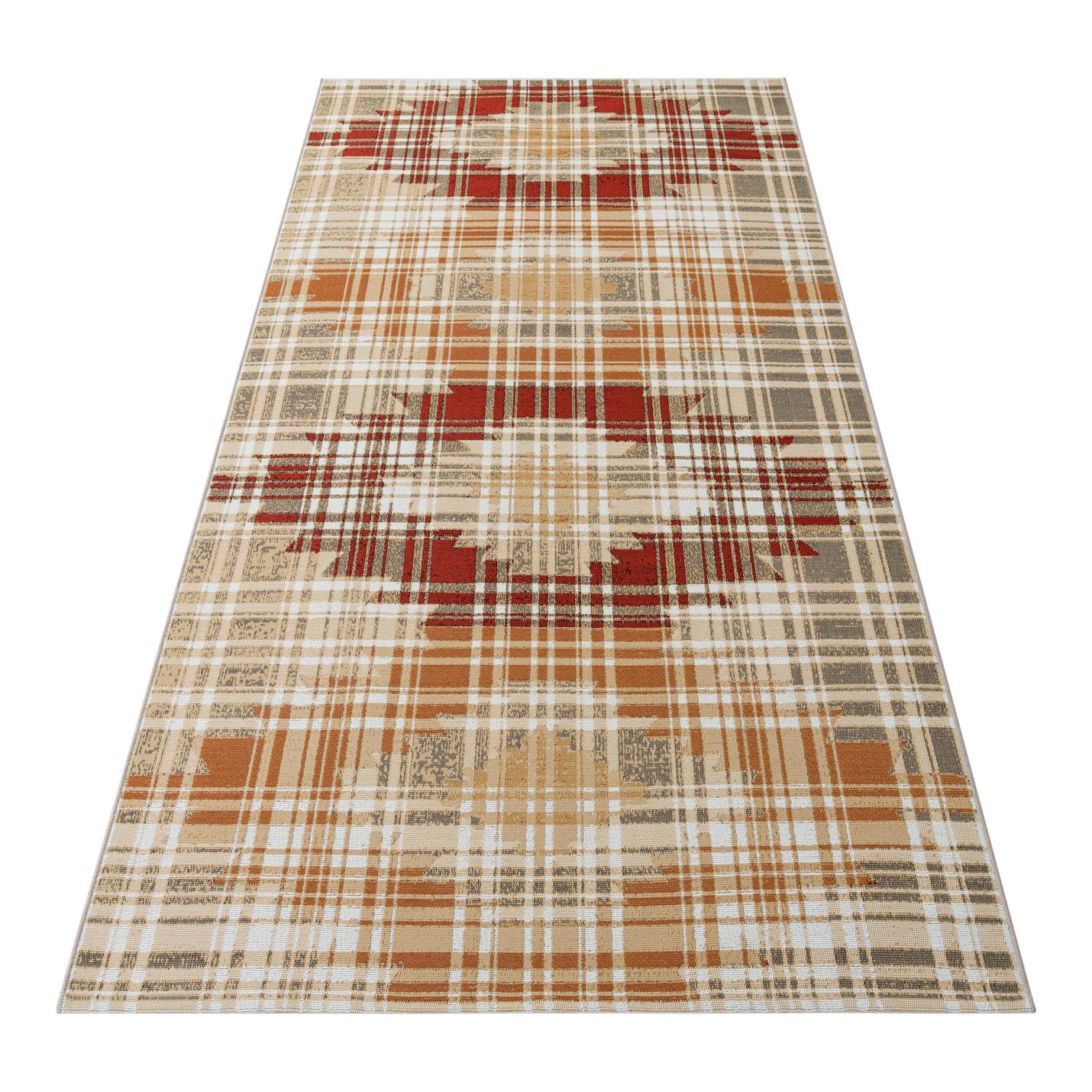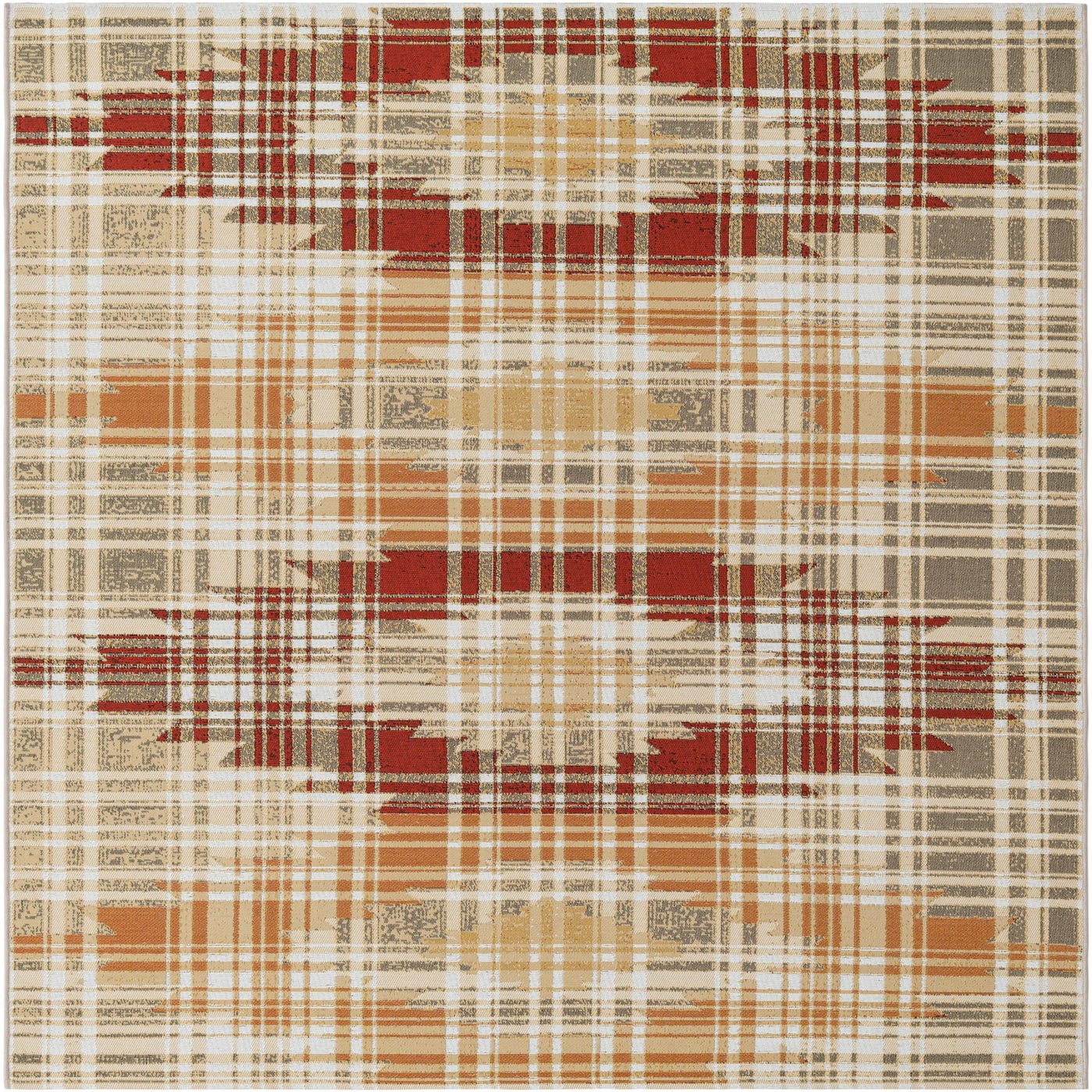 A 5x8 rectangular indoor/outdoor rug featuring a modern abstract plaid pattern in multi-colored hues of red, orange, beige, and gray.