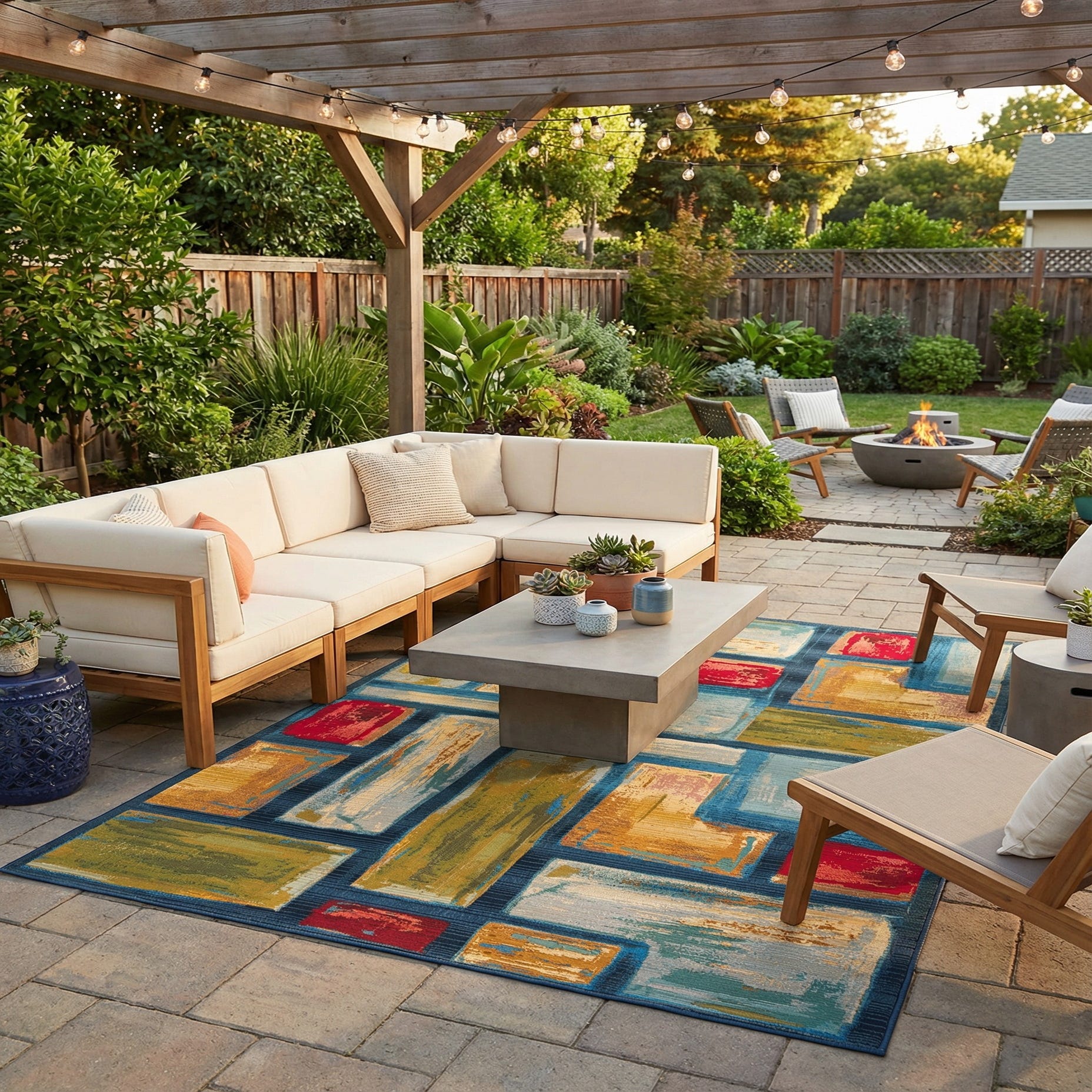 Machine-made of 100% polypropylene, the rug has a low, dense pile with a slightly ribbed surface that you can feel when you run your hand across it. That resilient texture holds the design’s crisp edges while allowing the brushstroke details to remain visible. It works well on a covered patio or sunroom, in a modern living room or dining area, and as a colorful anchor in an office or entryway. Pair it with warm wood furniture and brass accents to bring out the golds, or use neutral sofas and navy pillows to highlight the blues and reds for a balanced, contemporary scheme.