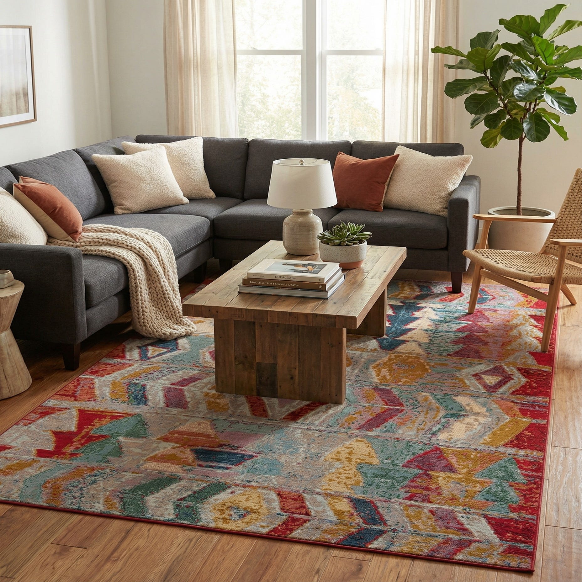 Machine-made of 100% polypropylene, the rug has a low-profile, tightly woven surface that feels firm and slightly resilient underfoot. It works well on a covered patio or screened porch as a colorful anchor, beneath a casual dining set on a terrace, or layered in a living room to add warmth and pattern to neutral seating. Pair it with natural wicker or rattan, warm wood tones and terracotta planters for an inviting outdoor-minded scheme, or combine with mid-century lines and solid upholstery to let the pattern and colors stand out.