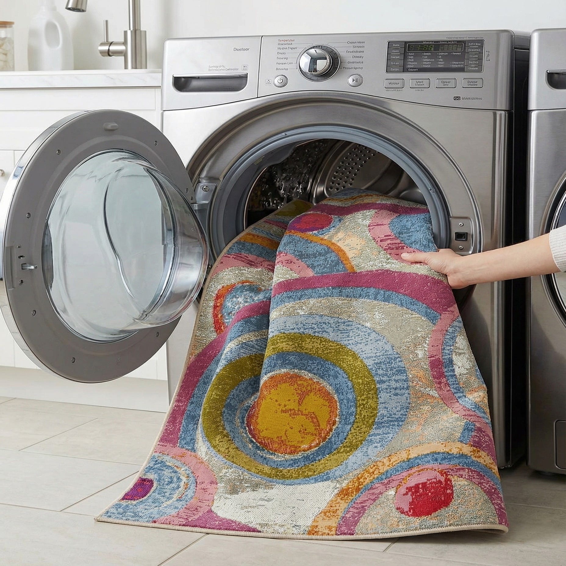 Place this rug on a covered patio or sunroom to introduce color and movement to outdoor-adjacent spaces, or use it in a casual living room or dining area to anchor contemporary seating. It also complements eclectic and mid-century modern interiors—pair it with warm wood furniture, navy upholstery, or woven seating to balance the graphic design and bring a cohesive, playful energy to the room.