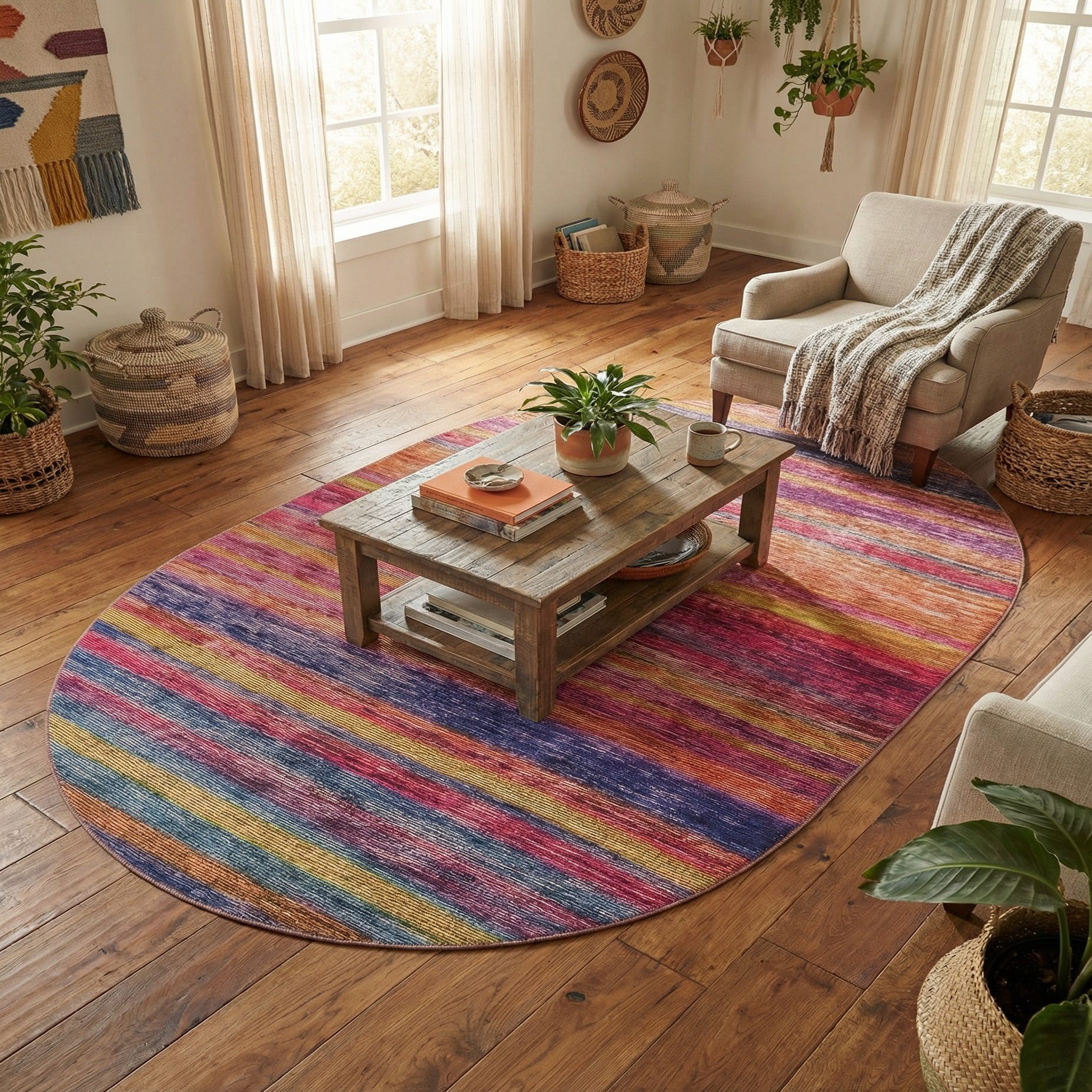 An oval rug with softly striated horizontal bands in a lively multi-color ground, this design layers shades of beige, blue, brown, yellow, pink, violet, navy blue and red in a brushed, painterly stripe. The color transitions have a lived-in, slightly vintage effect that keeps the pattern dynamic without sharp contrast, offering a contemporary-bohemian look that works as an anchor in casual and curated rooms alike.