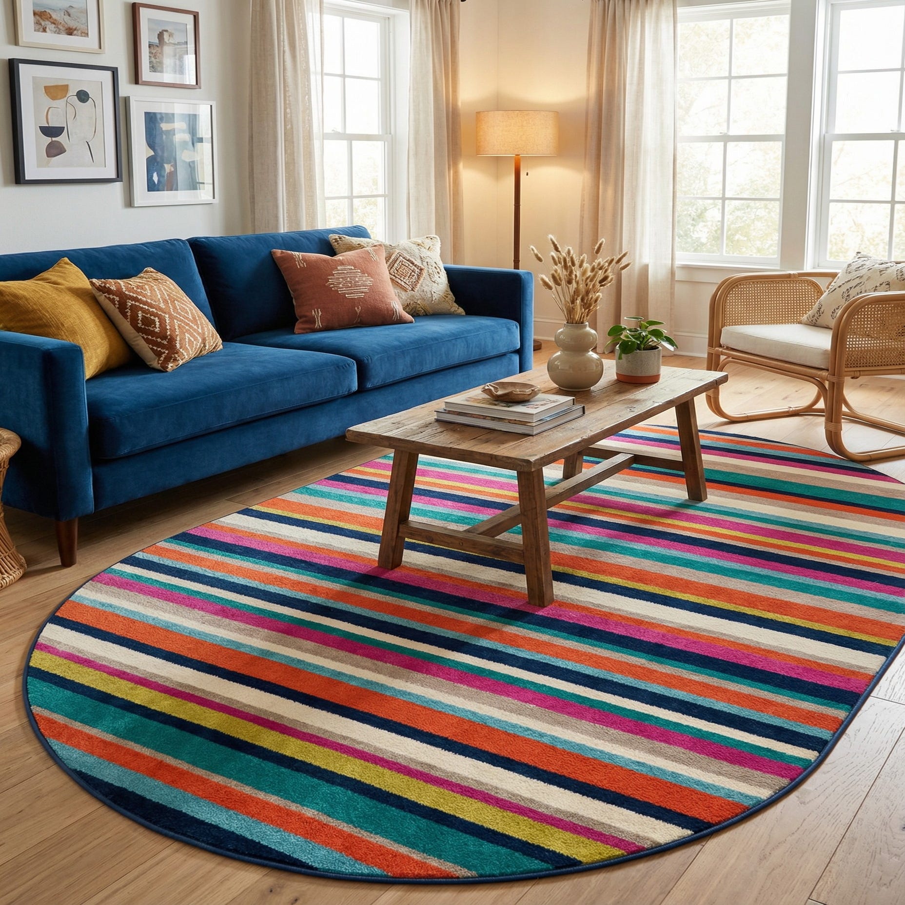 This rug is well-suited to lively living rooms, a cheerful entryway, a child's bedroom or a casual dining nook where the oval shape complements round tables or seating arrangements. It pairs naturally with mid-century pieces and warm wood tones, adds a punch of color to minimalist interiors, and works with coastal palettes thanks to the navy and aqua accents. Use it to define a small seating area, brighten a hallway, or layer into an eclectic space for added pattern and color.