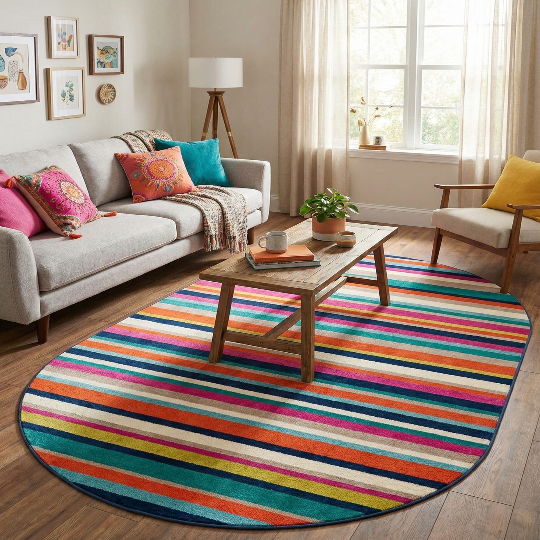 This rug is well-suited to lively living rooms, a cheerful entryway, a child's bedroom or a casual dining nook where the oval shape complements round tables or seating arrangements. It pairs naturally with mid-century pieces and warm wood tones, adds a punch of color to minimalist interiors, and works with coastal palettes thanks to the navy and aqua accents. Use it to define a small seating area, brighten a hallway, or layer into an eclectic space for added pattern and color.