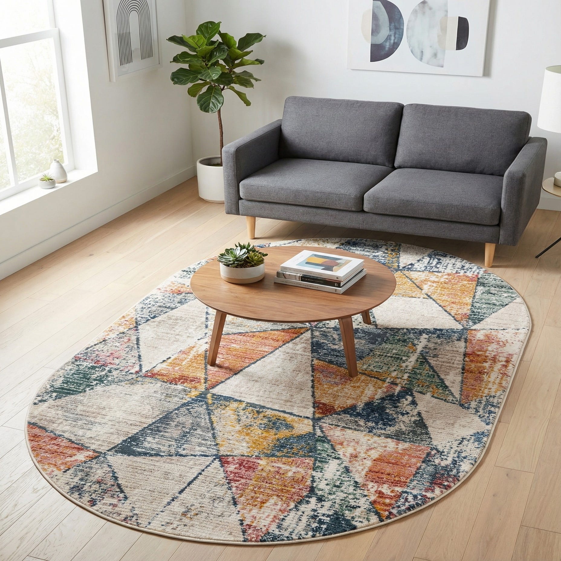 A lively geometric design of overlapping triangles creates a faceted, contemporary look across a multi background. Muted ivory and beige planes alternate with color-washed shapes in blue, navy, gray, green, rust red, orange, peach, yellow and pink, all given a gently distressed finish that softens the edges and adds visual texture. The surface has a low-profile, even pile that feels smooth underfoot—soft enough for daily living yet structured to hold the pattern clearly across the oval field.