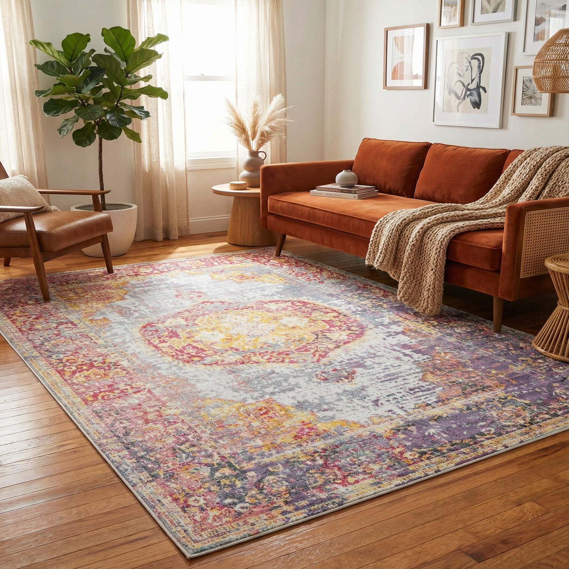 Ideal for a living room beneath a coffee table or anchoring a bedroom seating area, this rug brings color and pattern to both traditional and contemporary schemes. Pair it with neutral linen upholstery and brass accents to pick up the gold and yellow highlights, or use it in an eclectic, bohemian setup layered over hardwood with textured throws and mixed-pattern pillows to emphasize the violet and red accents. It also complements clean-lined, modern furniture when you want to introduce a touch of pattern without adding bulk.