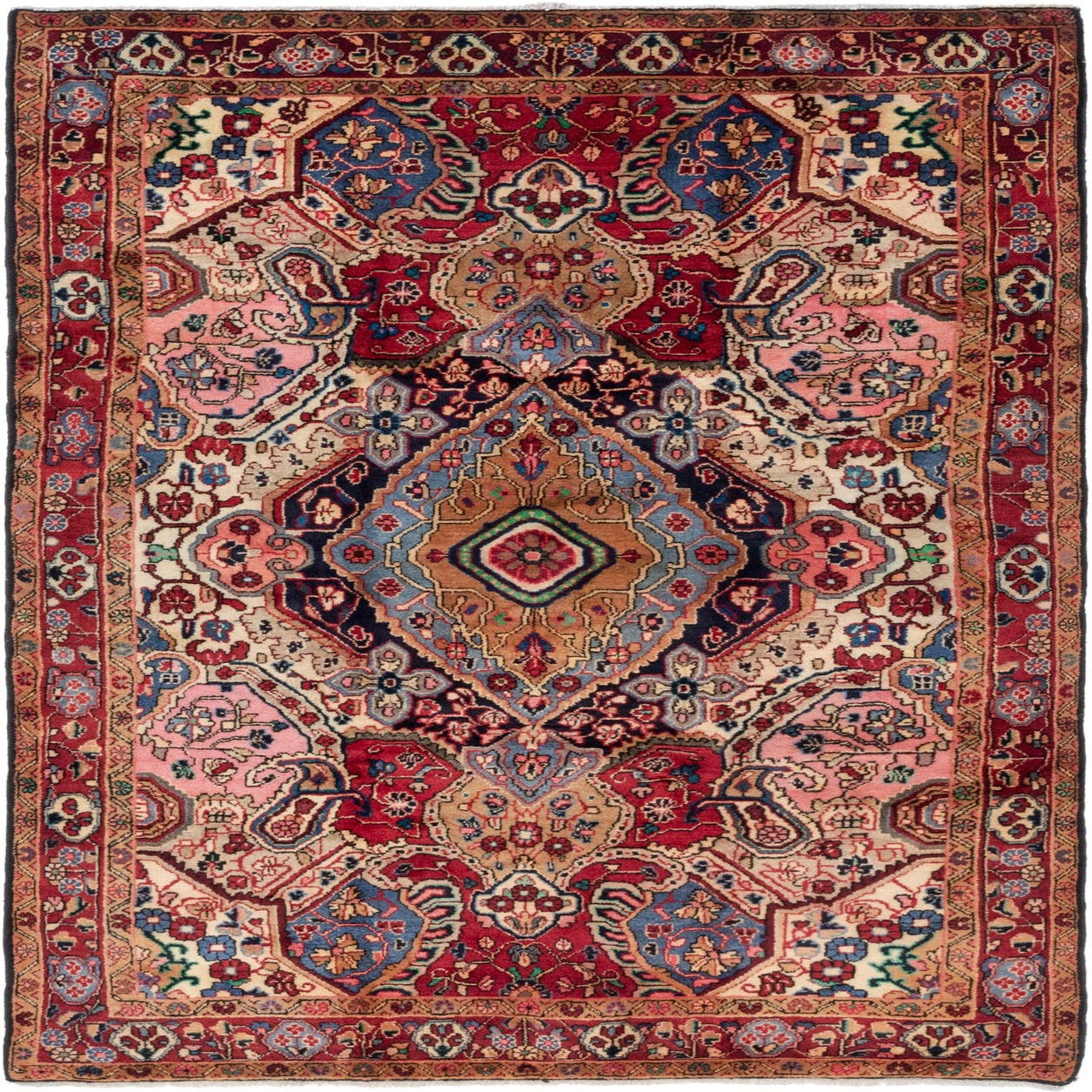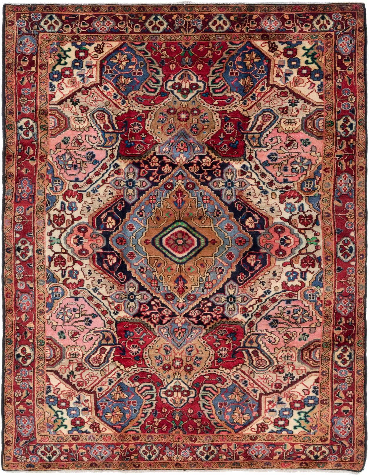 The Shahrbaft collection presents a meticulously handcrafted 5x8 wool rug, characterized by a rich tapestry of colors including beige, black, blue, brown, green, gold, ivory, navy blue, orange, pink, and red set against a multi-colored background. This semi-antique rug showcases a traditional design, featuring intricate floral and geometric patterns that exude a sense of time-honored elegance.