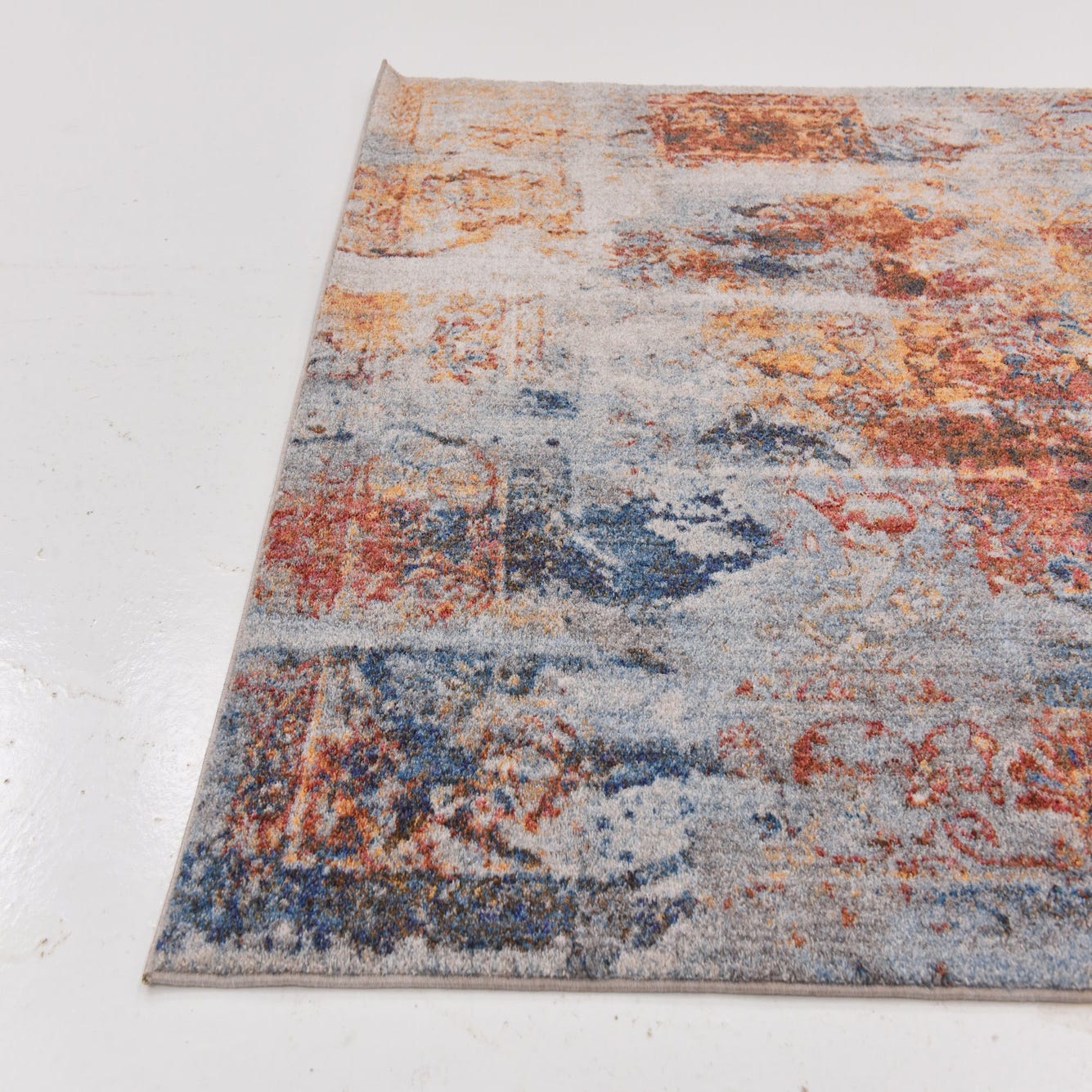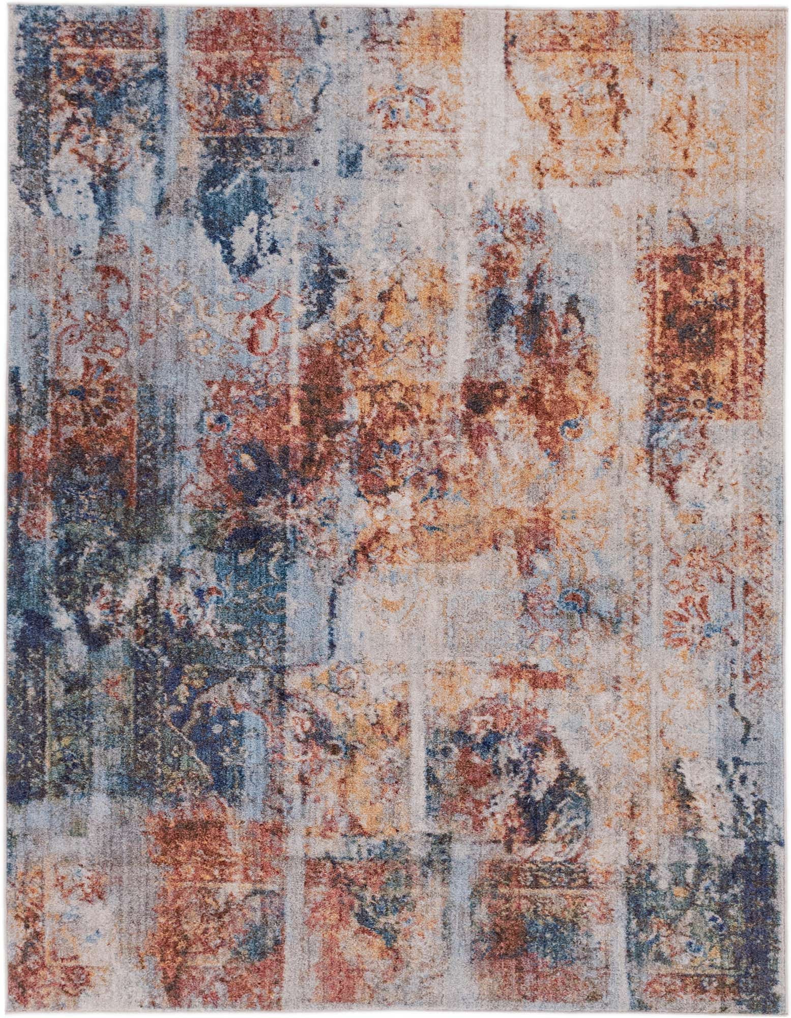 Primary color is Multi. Colors in this rug include: Multi, Blue, Navy Blue, Puce, Terracotta, Yellow, Gray, Gold, Ivory.