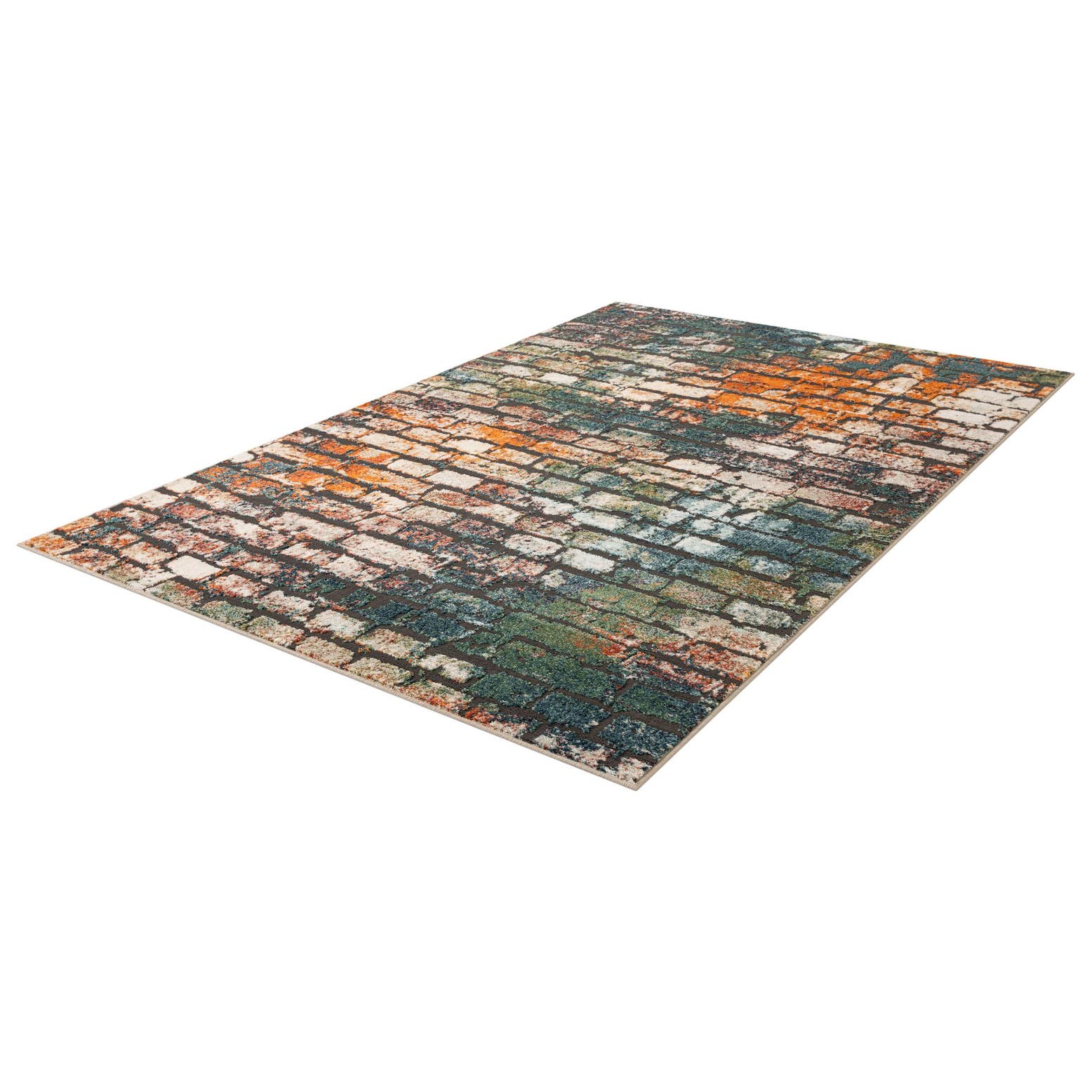A 5x8 rectangular multi-colored rug featuring a distressed brick wall pattern with shades of orange, green, blue, and white.