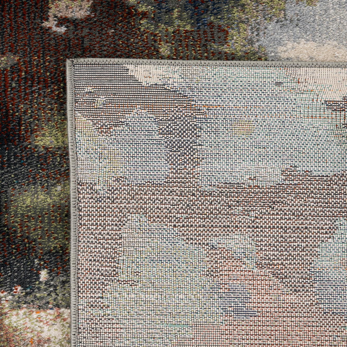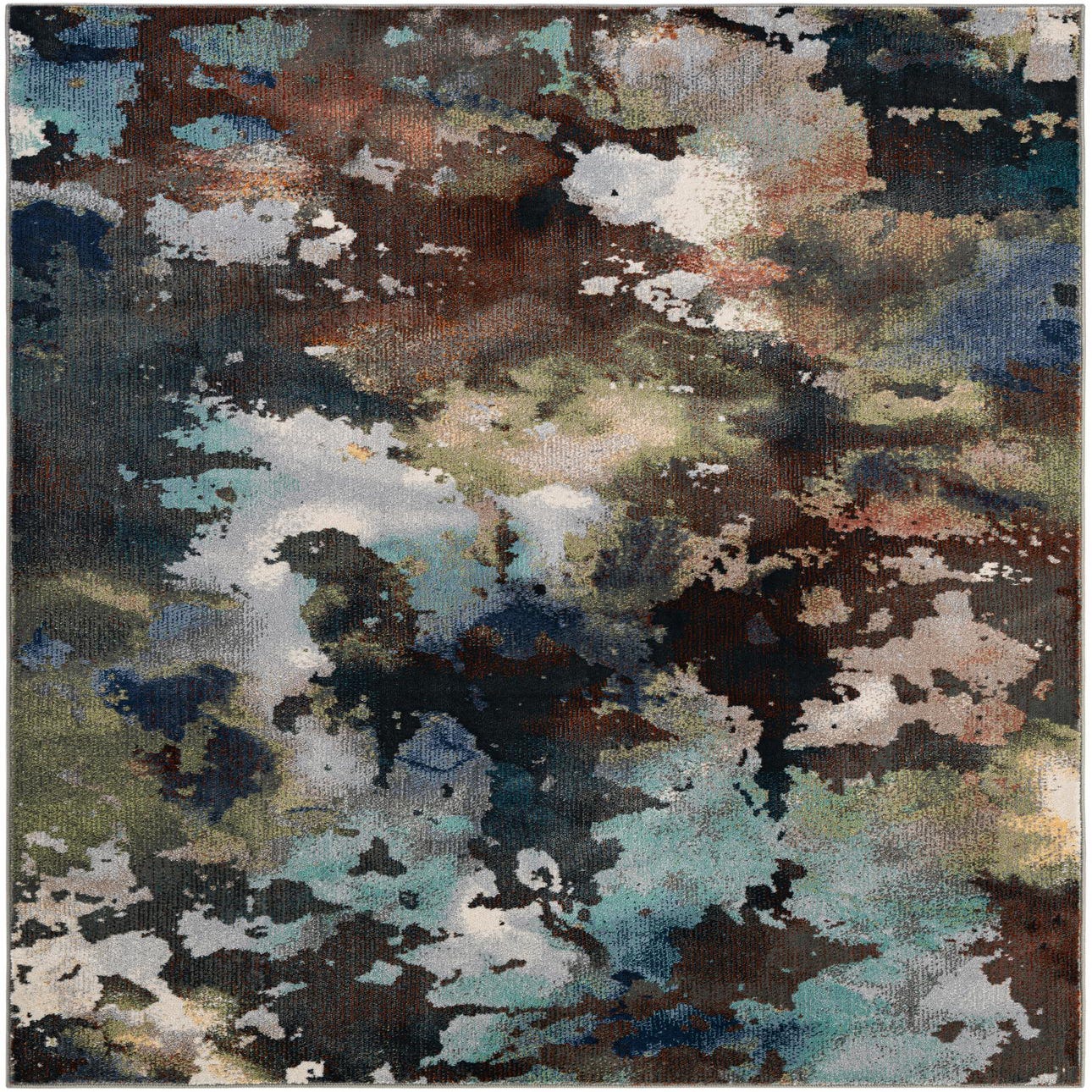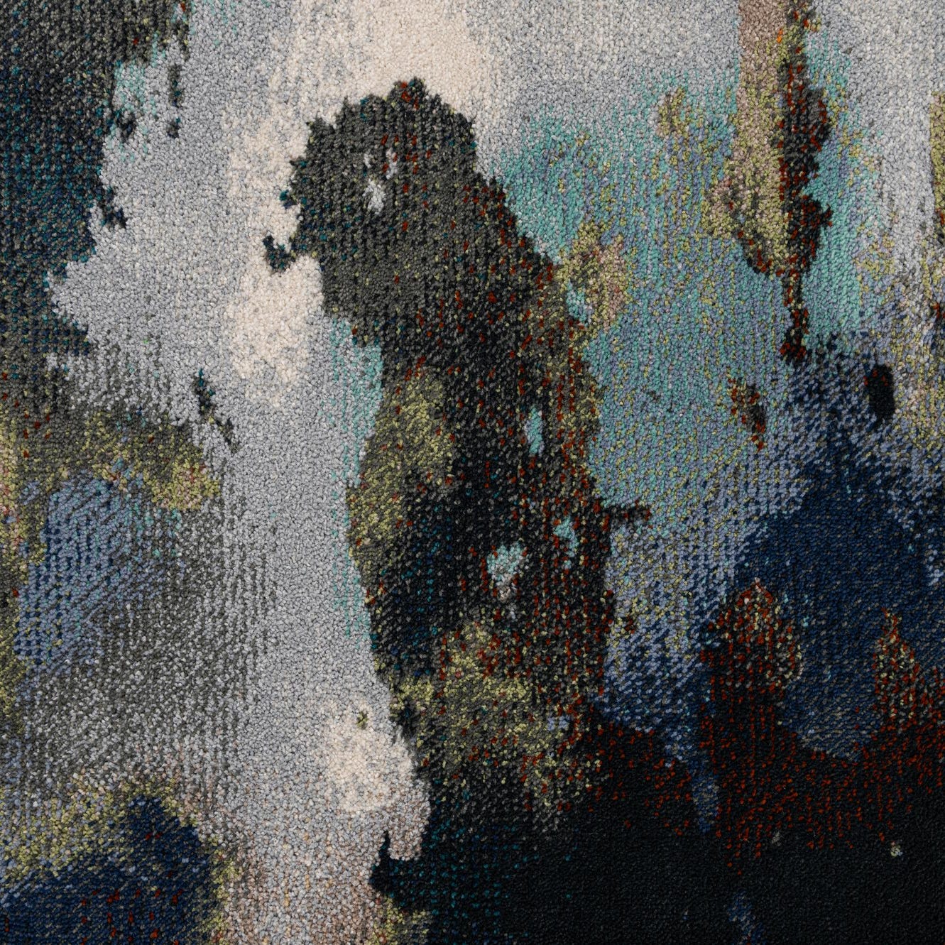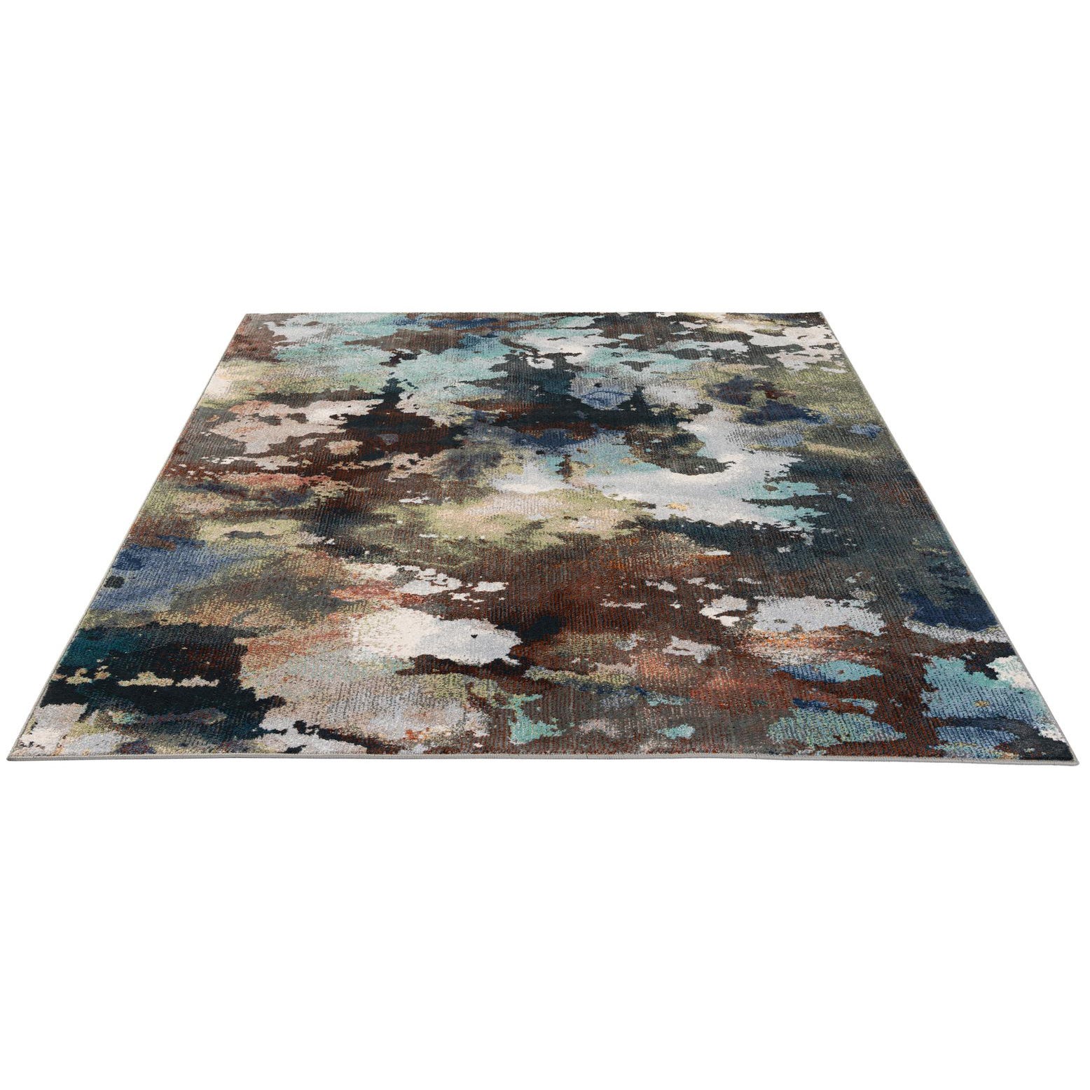 A 5x8 rectangular Theia Collection rug featuring a vibrant, multi-colored abstract pattern with shades of blue, green, brown, and grey.