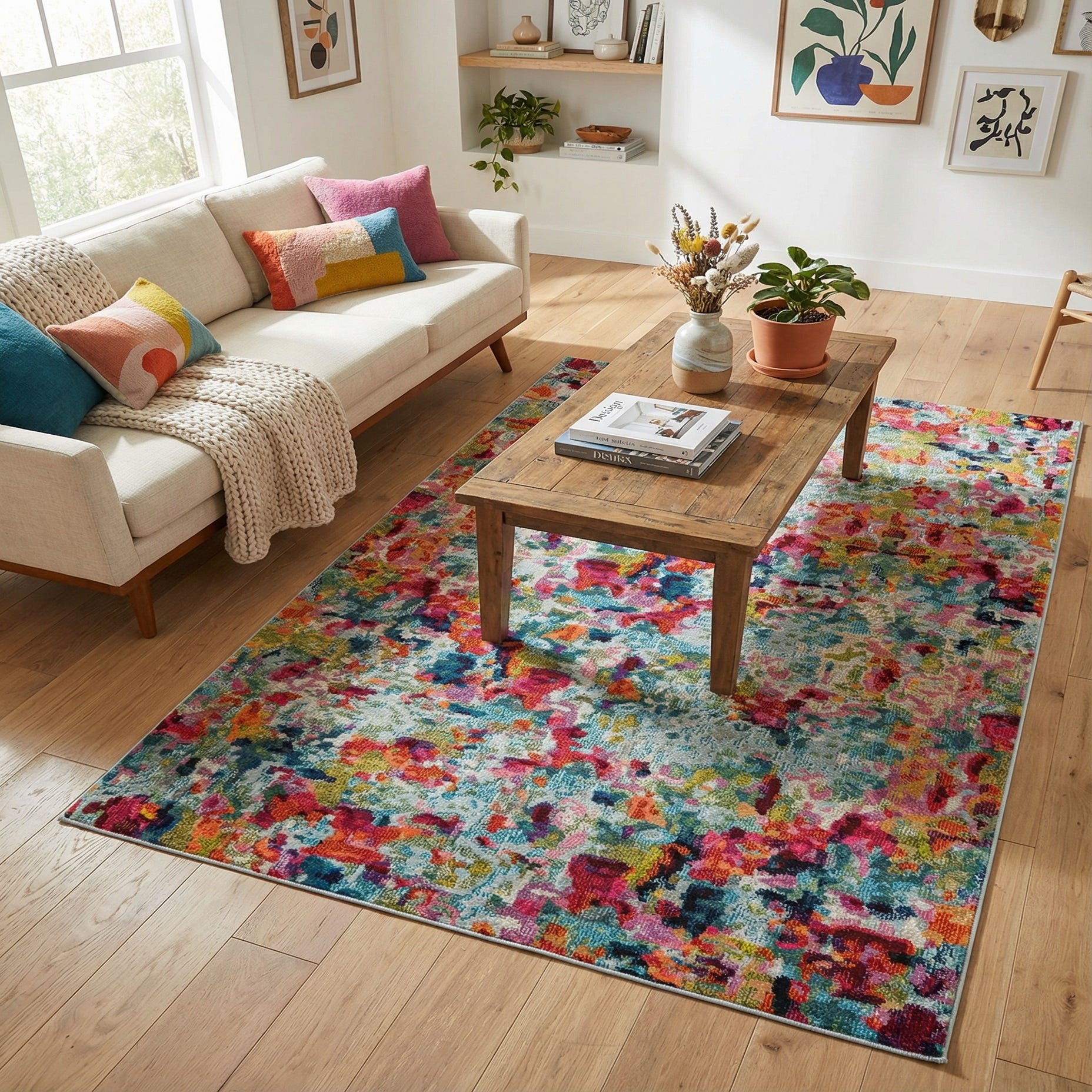 Use this rug to anchor a living room seating area, brighten a bedroom underfoot, or add personality to an entry or home office. It pairs well with mid-century silhouettes, modern neutral schemes, or eclectic and bohemian interiors that welcome layered patterns and mixed textures. For a cohesive feel, draw one or two colors from the rug into pillows or art to create a pulled-together arrangement.