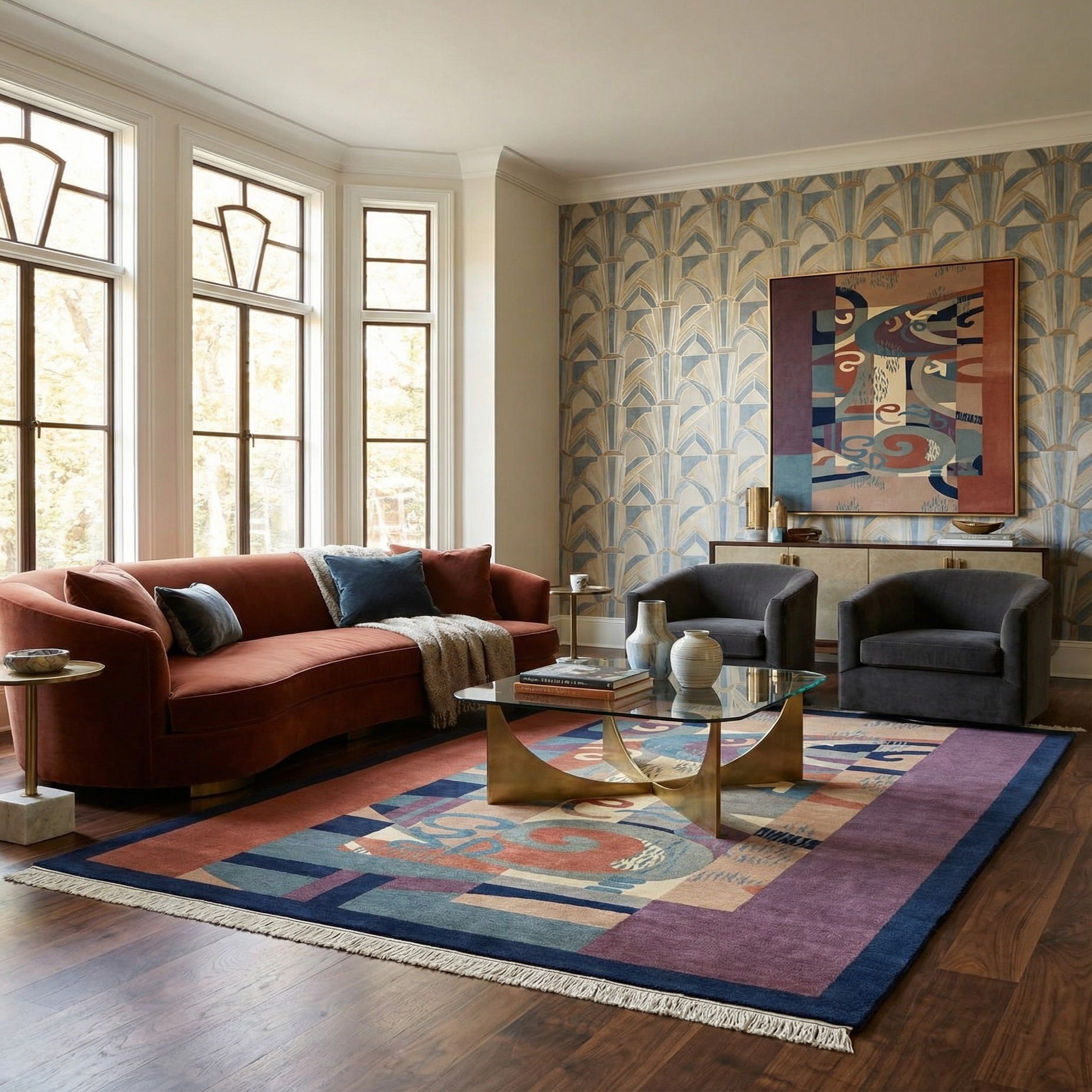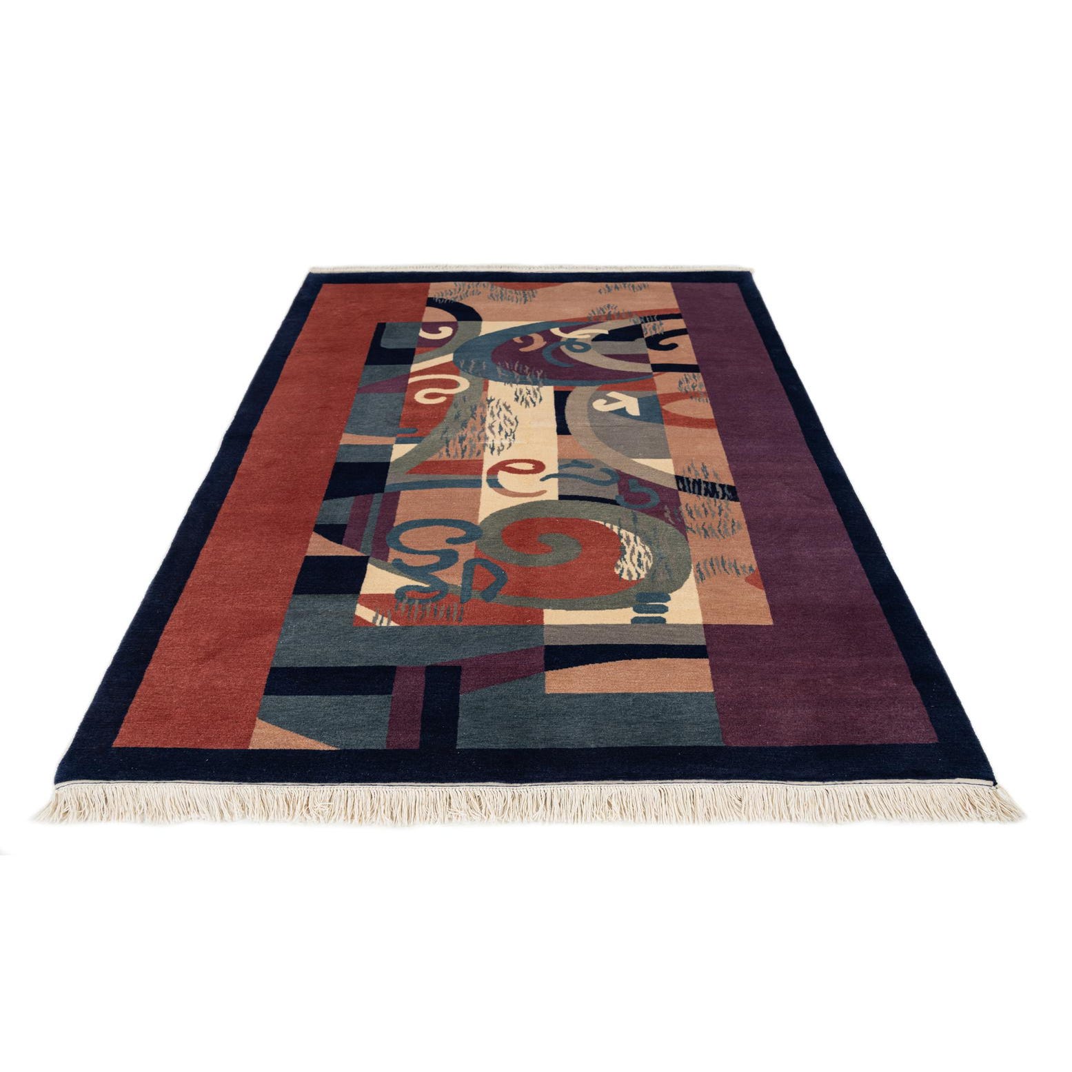 A 5x8 rectangular multi-colored wool rug with a modern abstract design and a dark border, suitable for a living room.