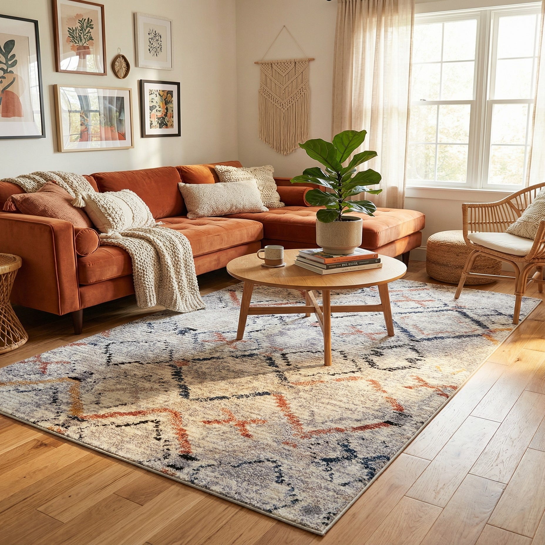 Machine made from 100% polyester, the rug has a soft, low-profile pile with a slight sheen that feels pleasant underfoot and lays flat beneath furniture. Its color palette and relaxed pattern work well in contemporary or transitional living rooms to add visual interest beneath a coffee table, in bedrooms to warm a neutral scheme, or in eclectic and bohemian settings paired with textured throws and mixed wood tones. The design also complements navy or gray upholstery and pulls in accent colors for coordinated decor.