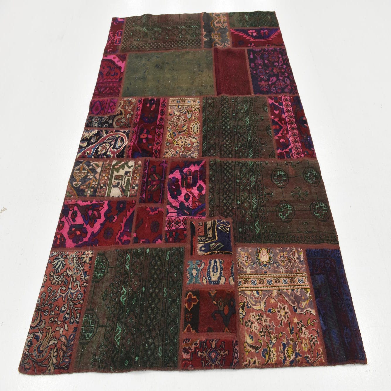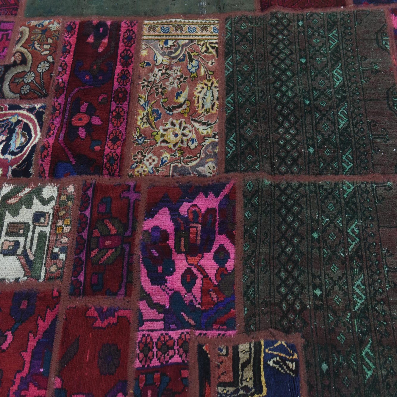 A 5x8 rectangular multi-colored patchwork rug featuring various Persian and abstract patterns in shades of pink, green, brown, and blue.